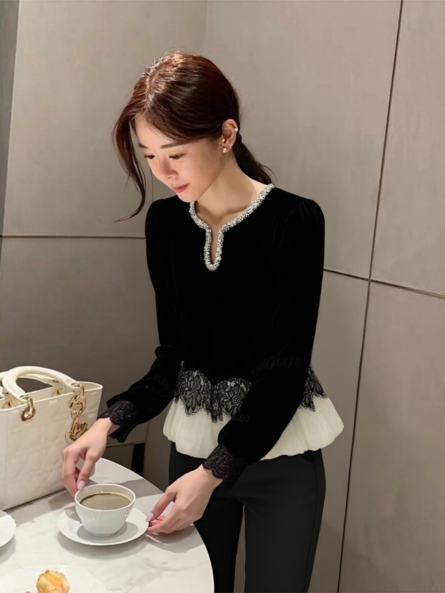 FA54074# 法式蕾丝拼接衬衫女冬高级感轻奢减龄洋气独特漂亮黑色丝绒上衣春 服裝批發女裝批發服飾貨源