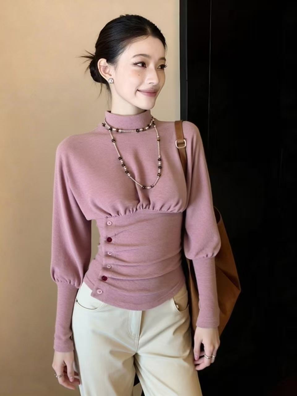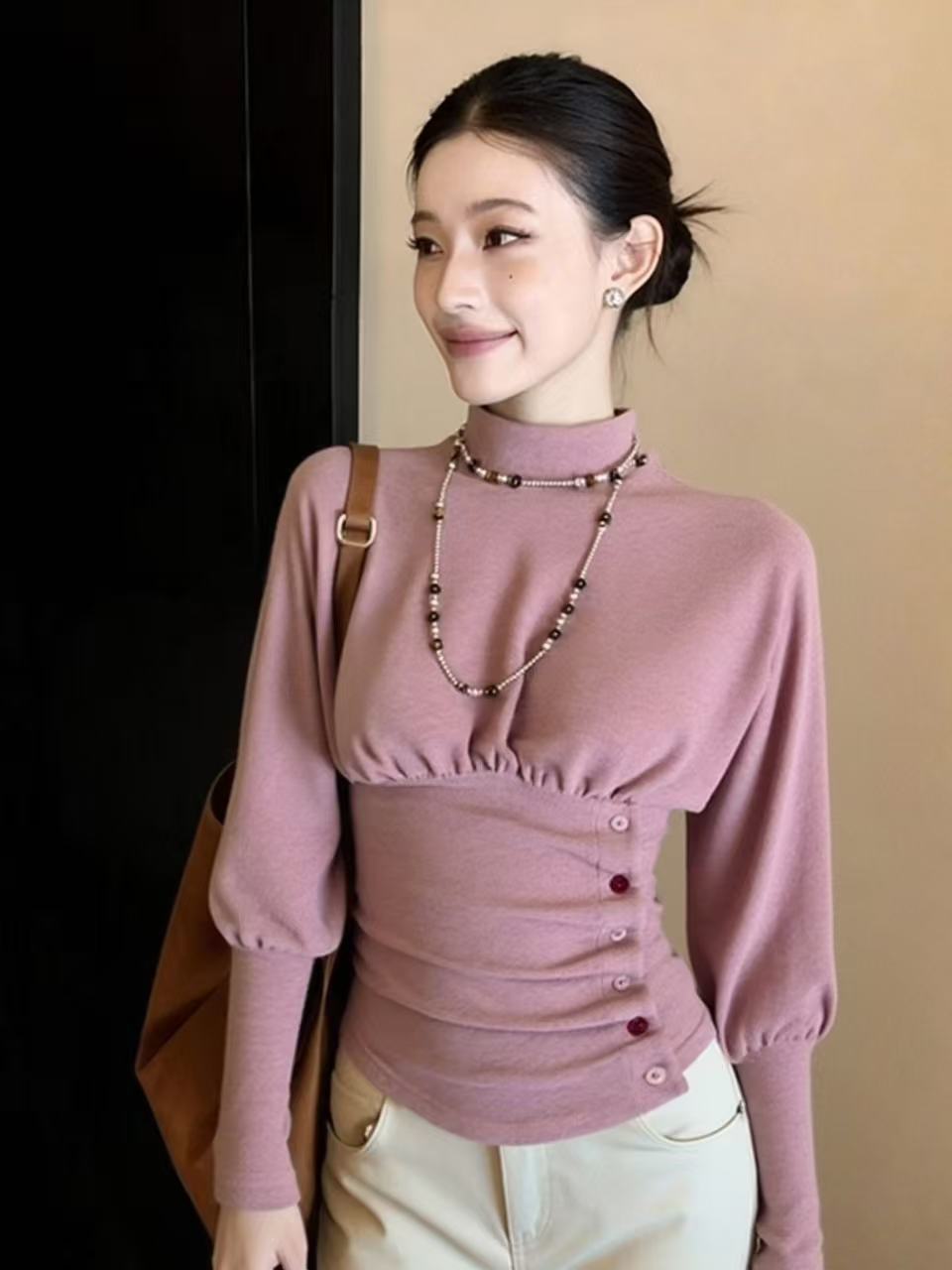 FA54279# 冬季新款气质独特小众设计轻熟收腰修身半高领粉色双面绒T恤 服裝批發女裝批發服飾貨源