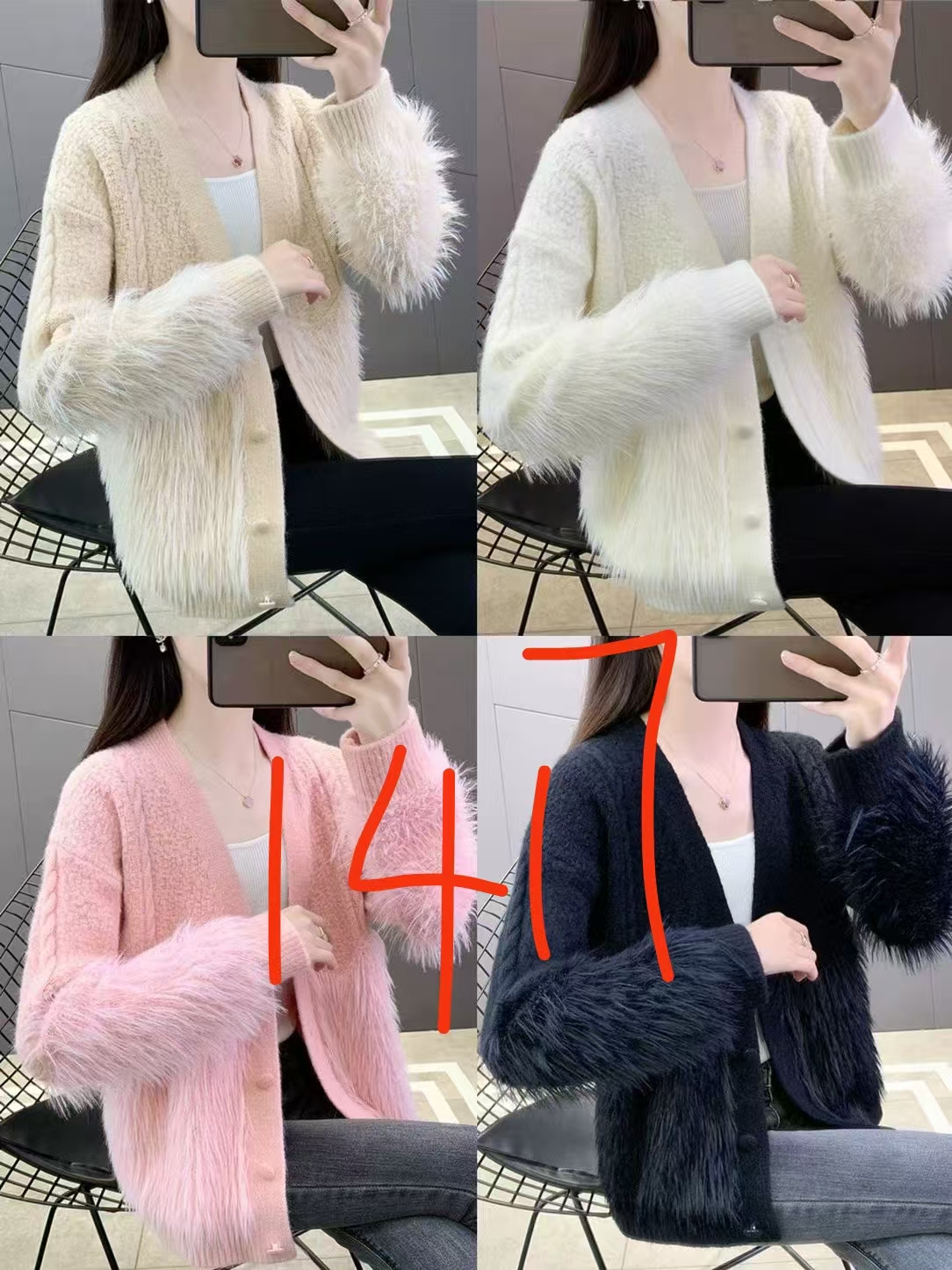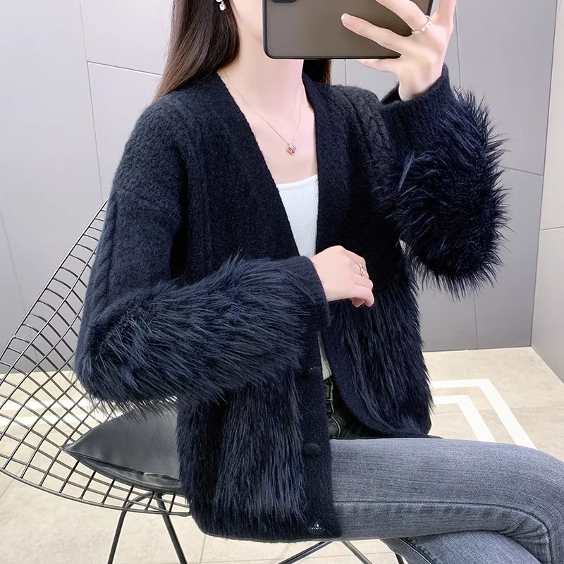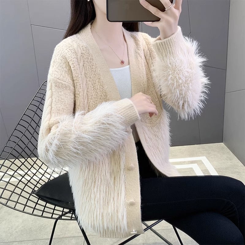 FA54693# 仿水貂绒开衫毛衣外套女春秋季加厚外穿慵懒风马海毛针织皮草拼接 服裝批發女裝批發服飾貨源