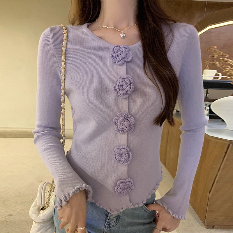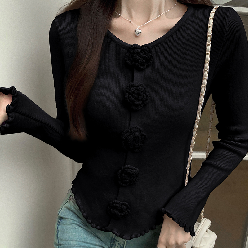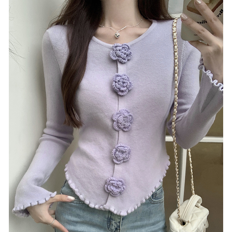 FA54696# 温柔风甜美立体花朵长袖女秋冬季新款修身显瘦打底针织衫 服裝批發女裝批發服飾貨源