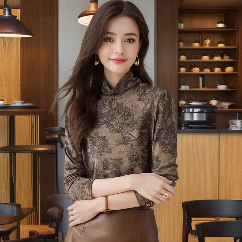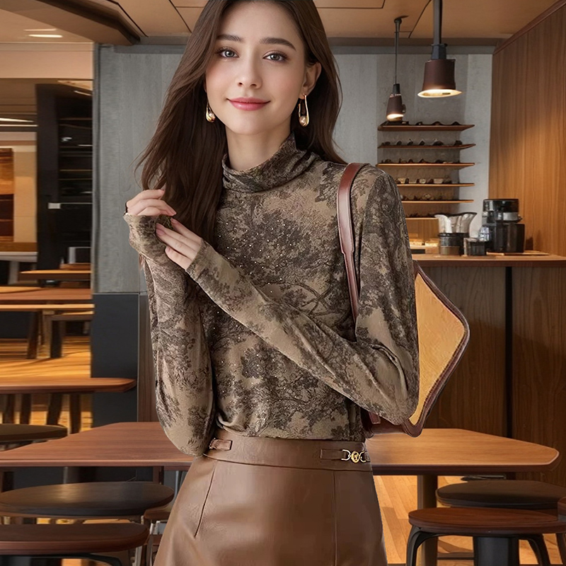 FA56227# 长袖上衣烫钻半高领修身高级水墨画打底衫女春新款印花T恤 服裝批發女裝批發服飾貨源