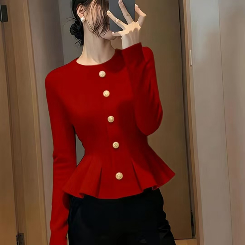 YF6986# 图片色韩版红色秋冬新款插肩袖圆领排扣修腰褶折感别致针织上衣