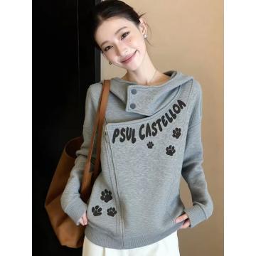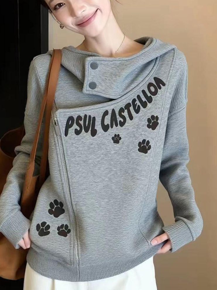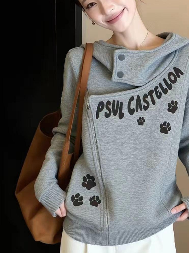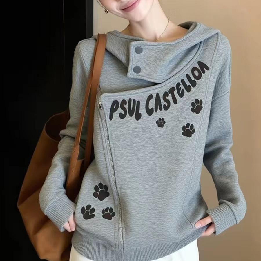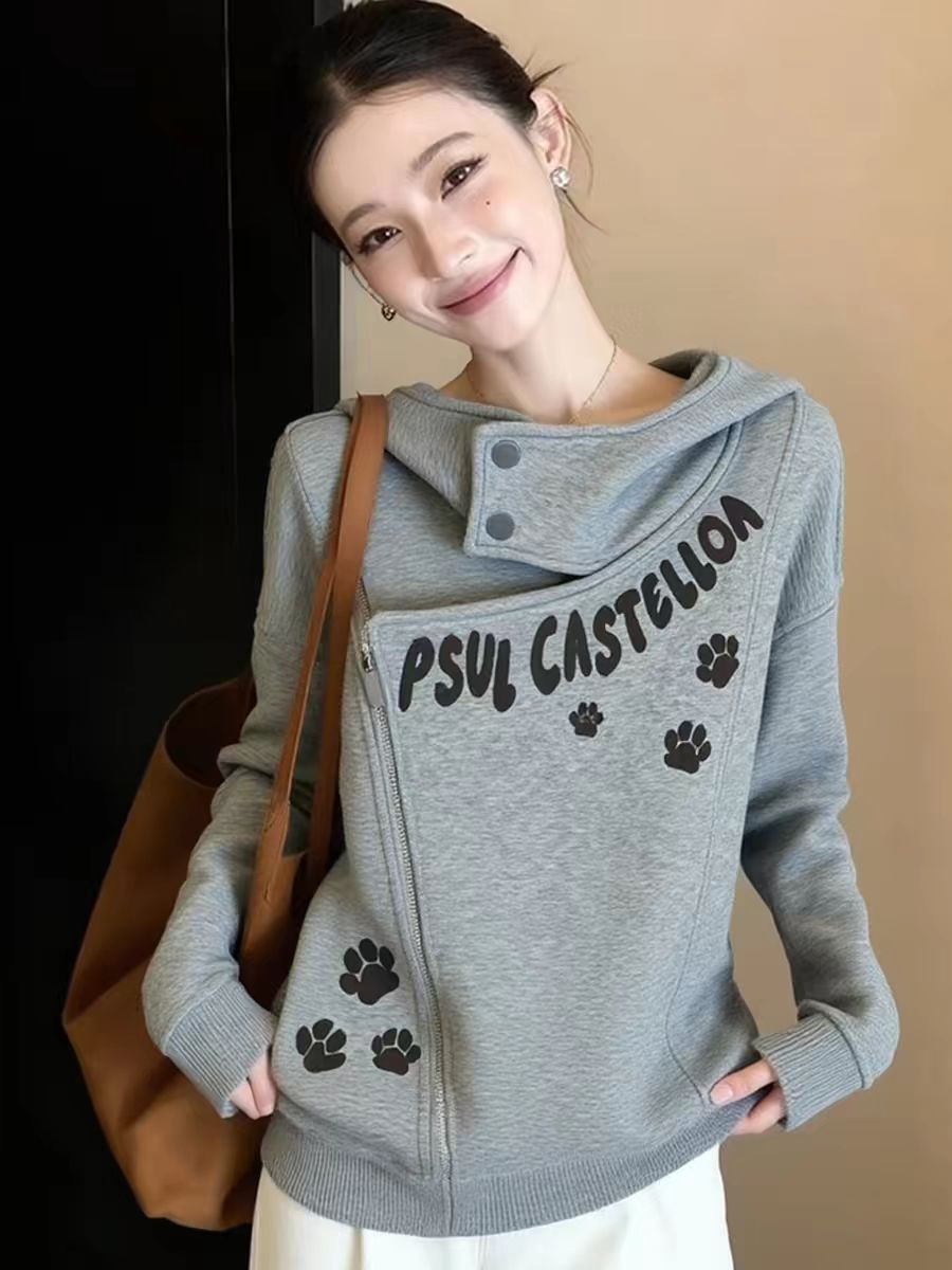 FA56734# 秋冬独特松弛感猫爪印花长袖卫衣女设计感小众慵懒风绝美百搭上衣 服裝批發女裝批發服飾貨源
