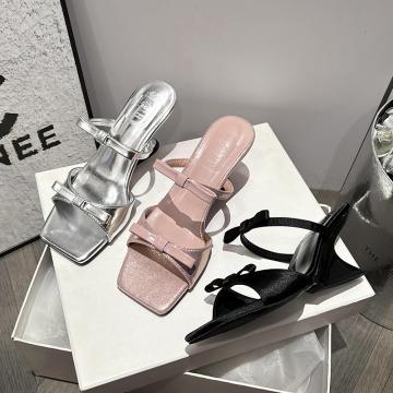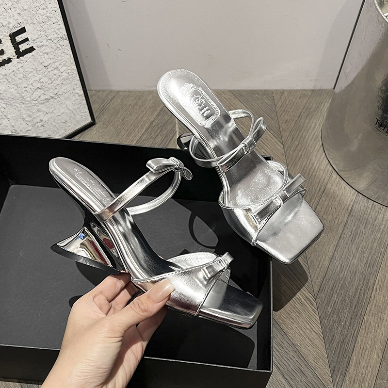 X-33082# 法式银色蝴蝶结坡跟凉拖鞋女夏外穿一字带凉鞋中跟高跟鞋罗马女鞋 鞋子批发女鞋批发凉鞋货源