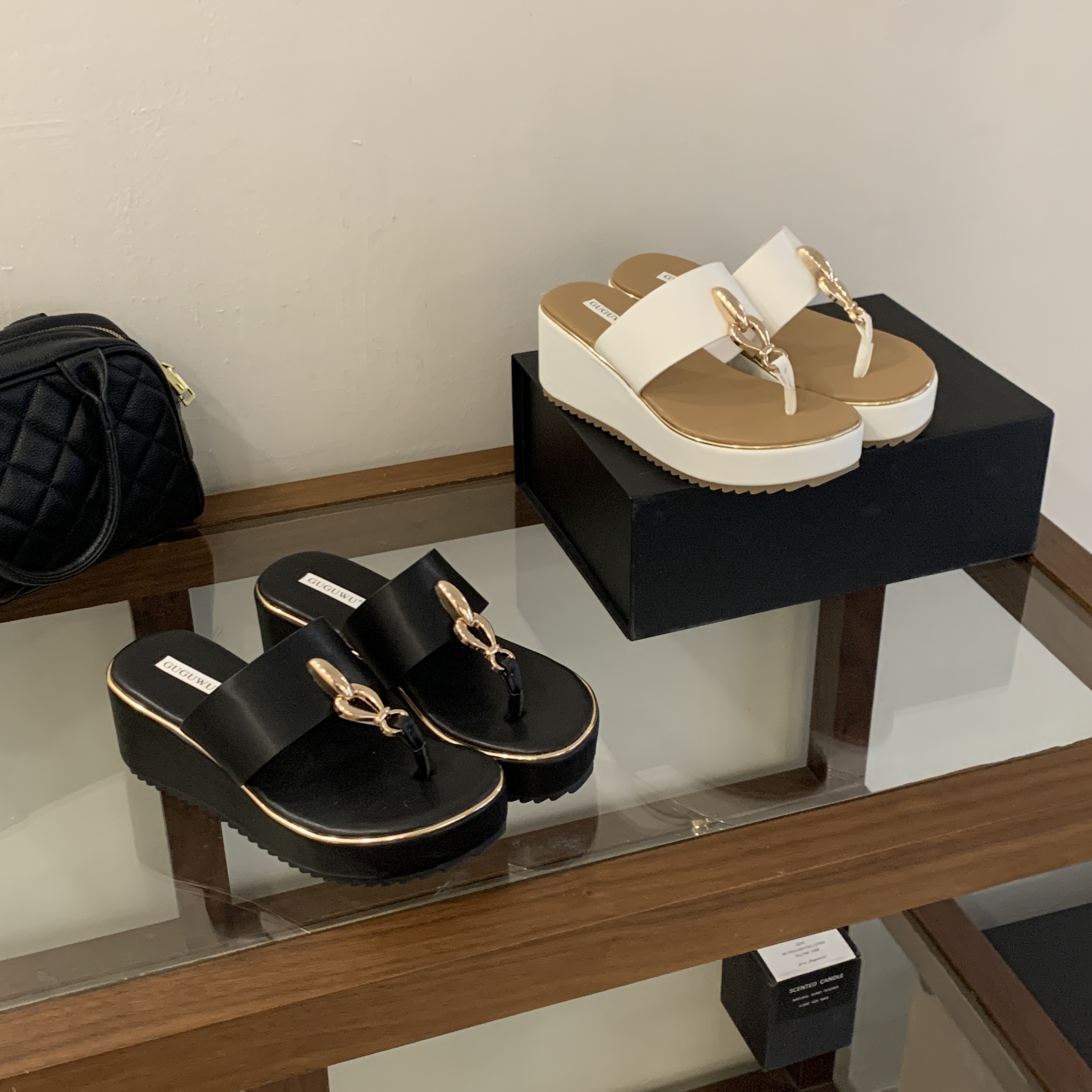 X-33112# 夏季新款坡跟夹脚拖鞋女金属链条装饰厚底凉拖外穿沙滩鞋 鞋子批发女鞋批发凉鞋货源