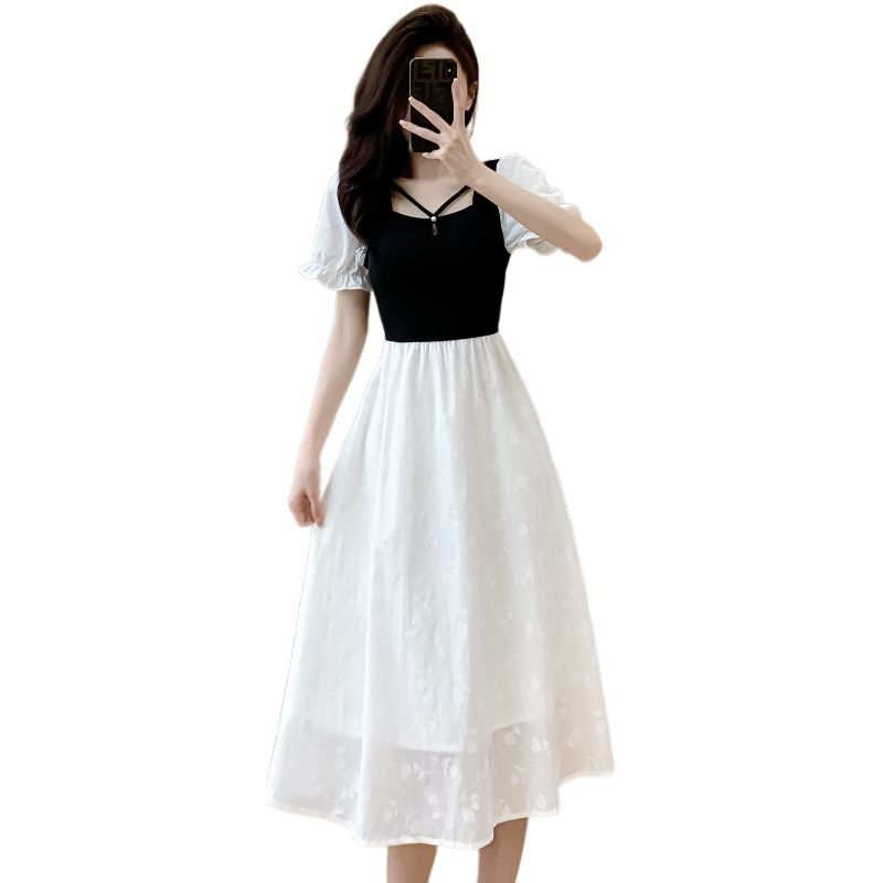 BY14123# 夏装假两件收腰显瘦方领连衣裙女气质优雅赫本风简约设计感中长裙 服裝批發女裝批發服飾貨源