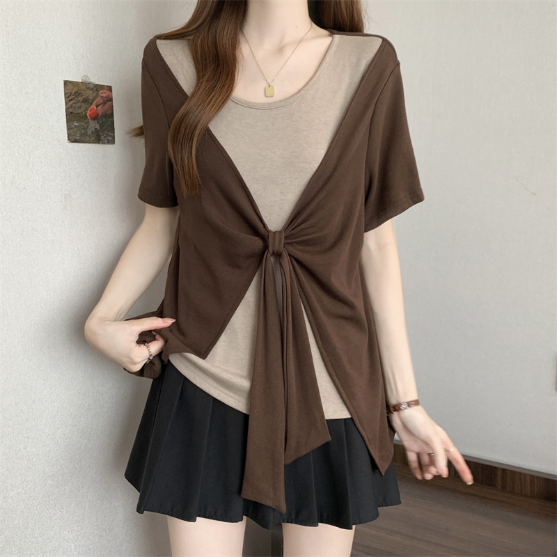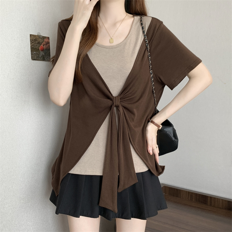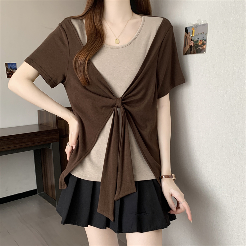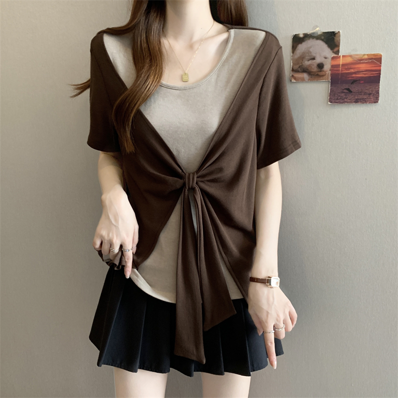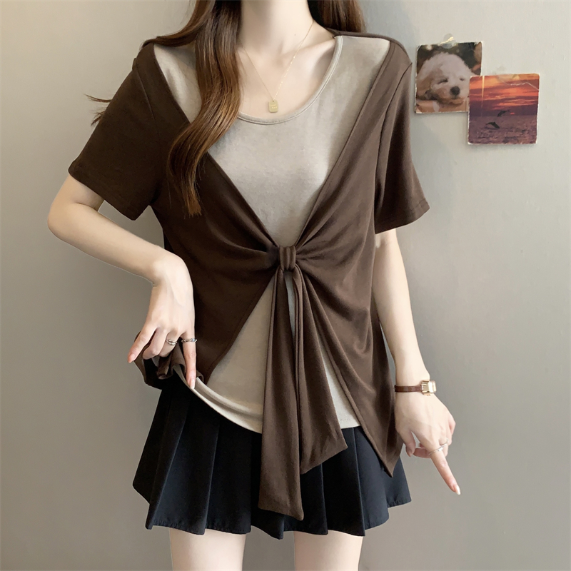 BY14130# 大码胖MM新款撞色拼接假两件圆领短袖T恤女时尚显瘦上衣 服裝批發女裝批發服飾貨源