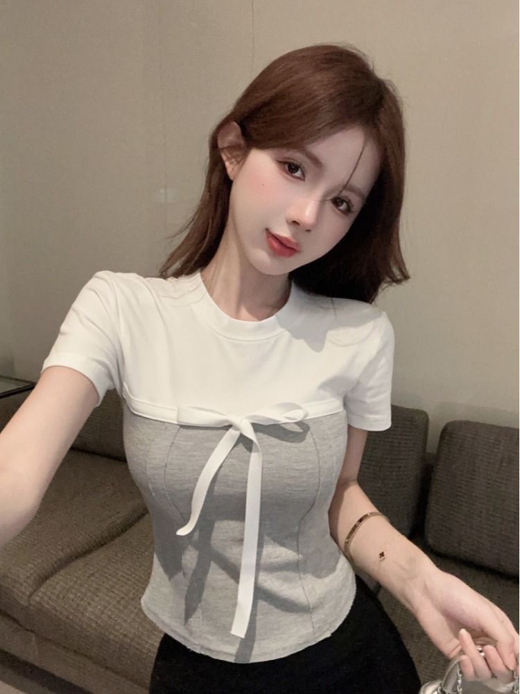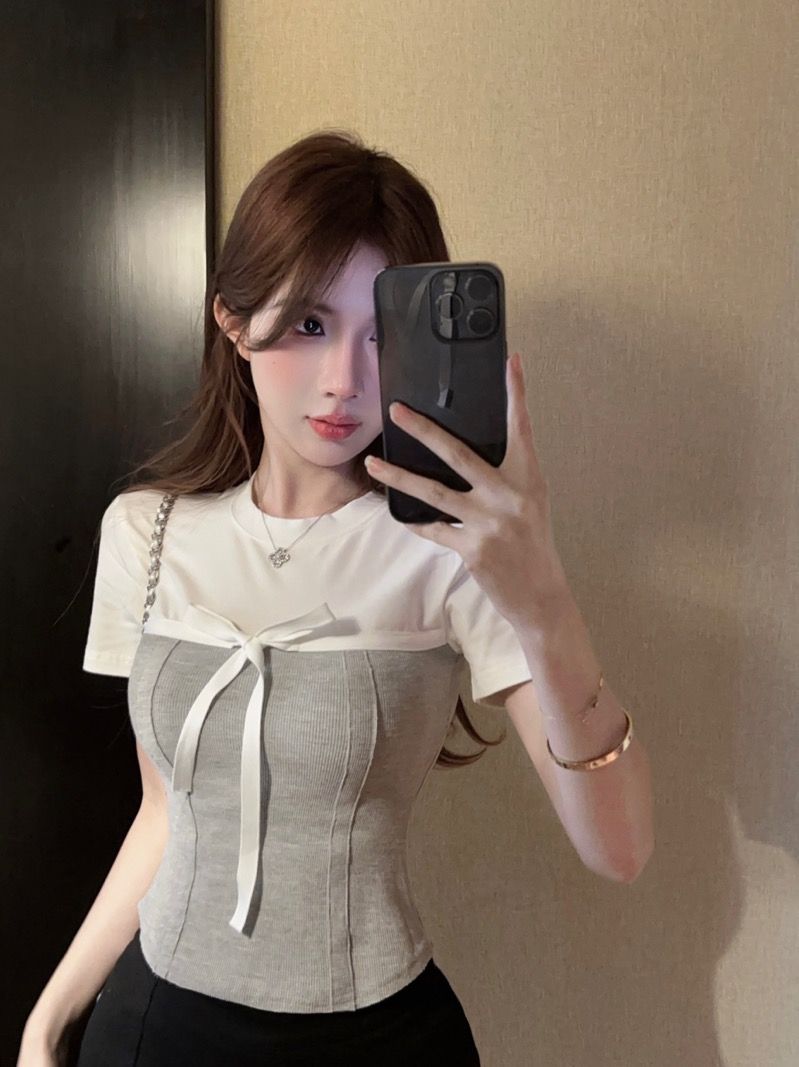 BY14144# 纯棉螺纹蝴蝶结假两件正肩短袖t恤女夏季 服裝批發女裝批發服飾貨源
