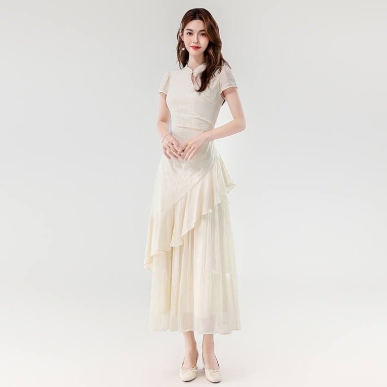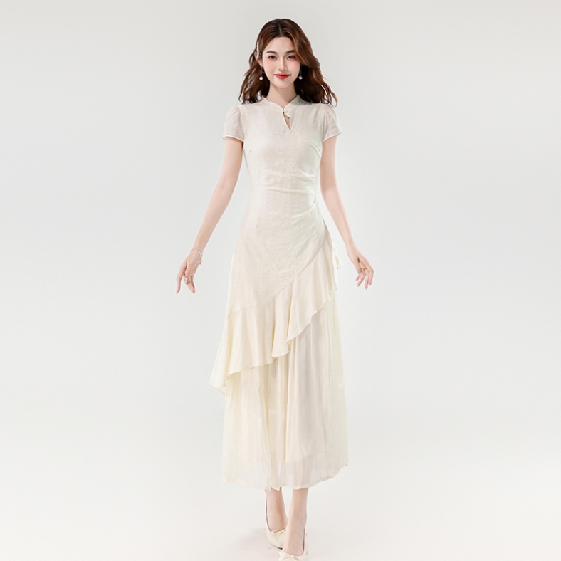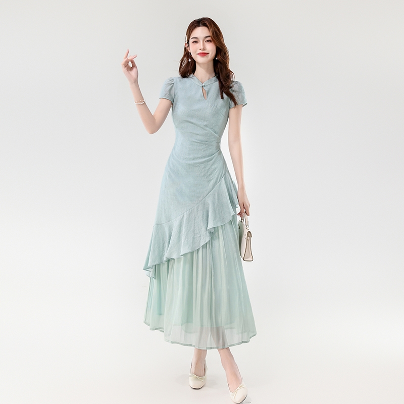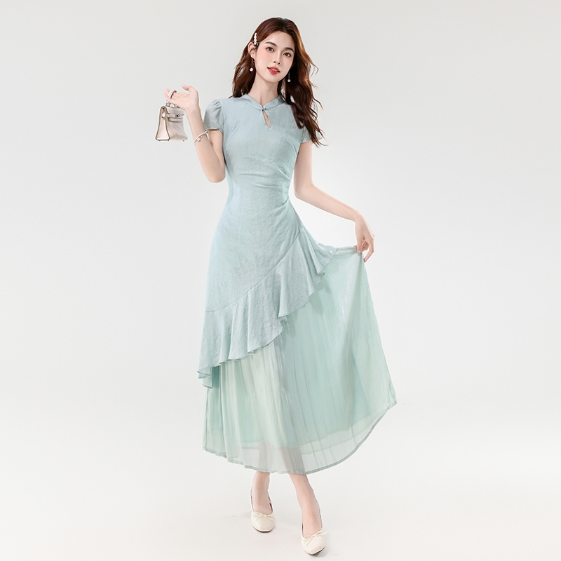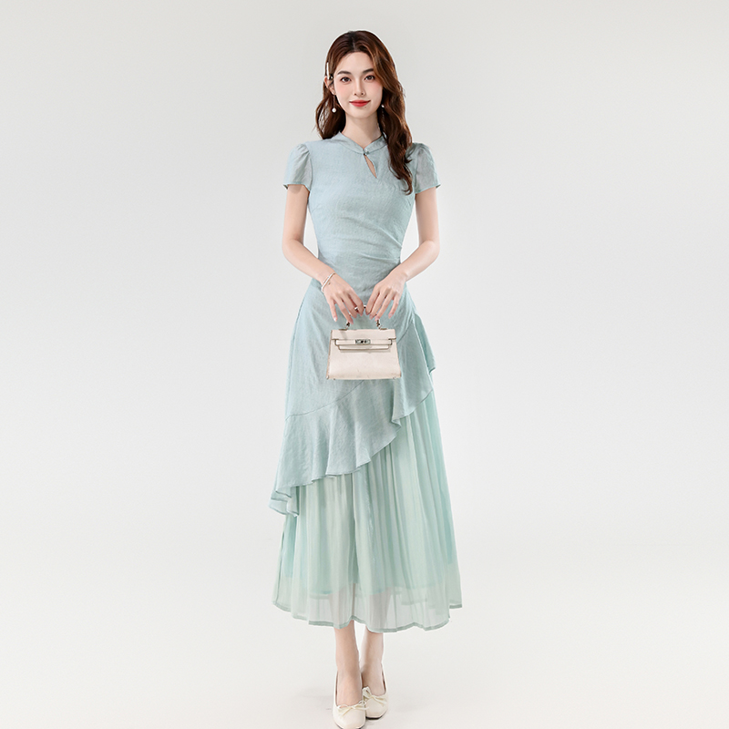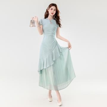 BY14182# 夏款新中式禅意温婉气质荷叶边不规则设计感假两件连衣裙 服裝批發女裝批發服飾貨源