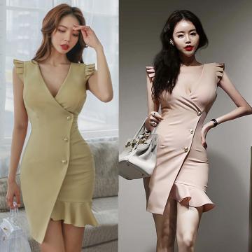 BY14213# 纯欲风性感飞飞袖连衣裙夏装新款深V收腰显瘦包臀裙法式鱼尾短裙 服裝批發女裝批發服飾貨源