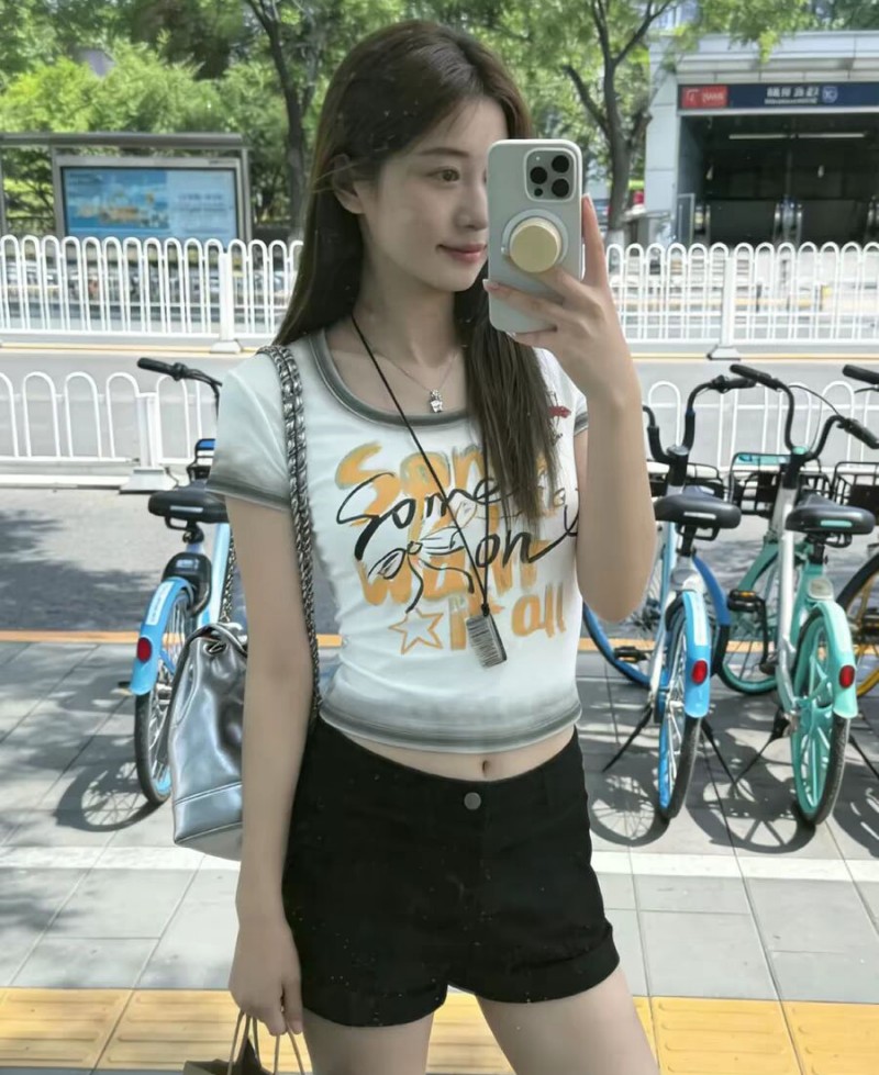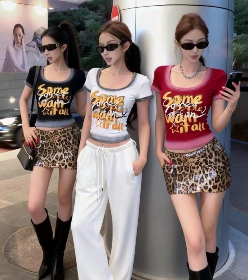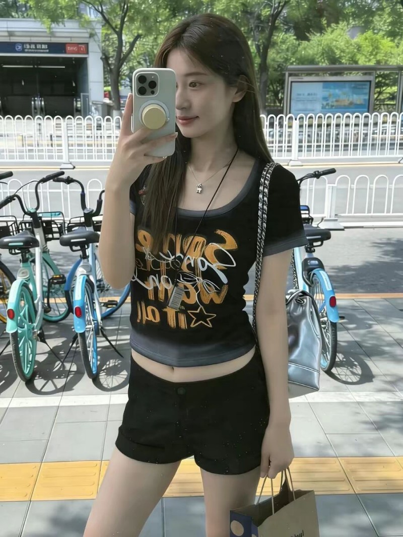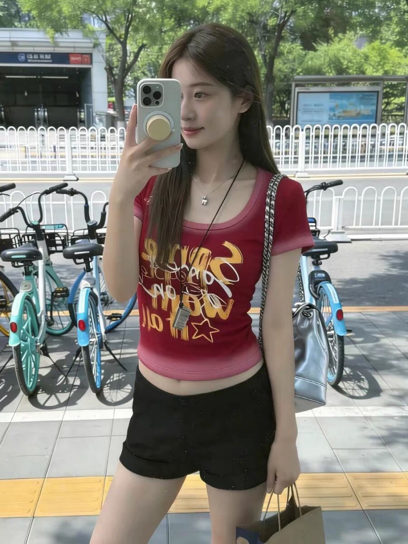 FA56864#性感U领露锁骨正肩短袖T恤女夏季美式辣妹渐变修身短款上衣潮