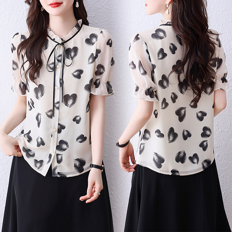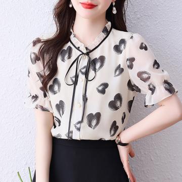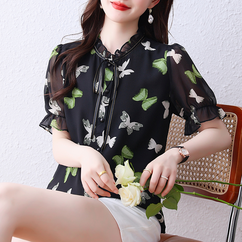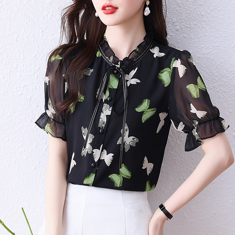 BY14259# 蝴蝶结印花雪纺衫女上衣夏装新款短袖洋气小衫宽松显瘦女衬衣 服裝批發女裝批發服飾貨源