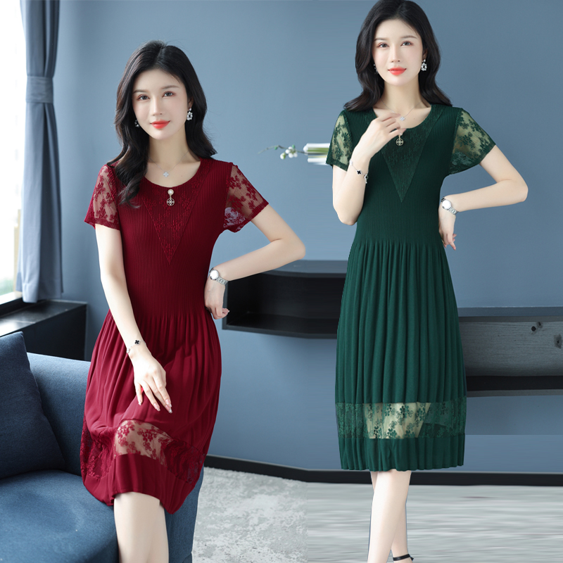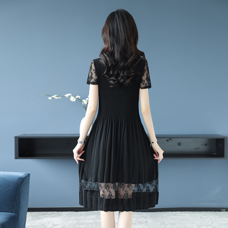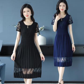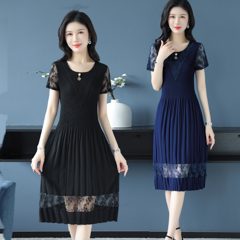 BY14326# 蕾丝拼接短袖百褶连衣裙女夏装新款三宅褶皱时尚修身雪纺裙子 服裝批發女裝批發服飾貨源