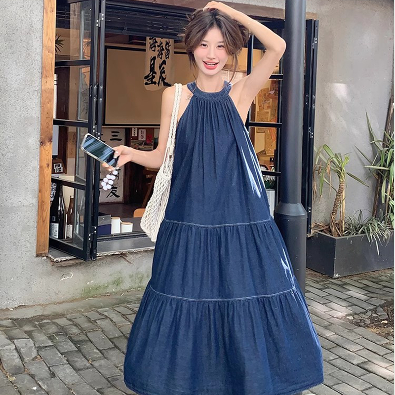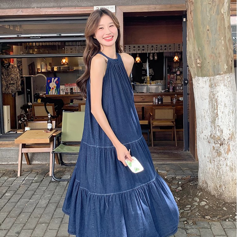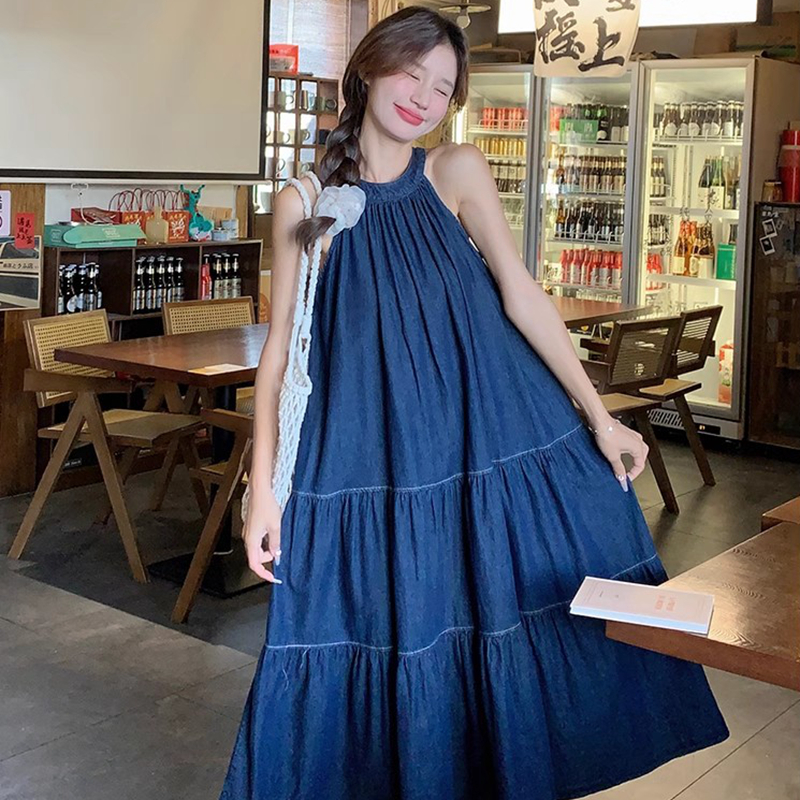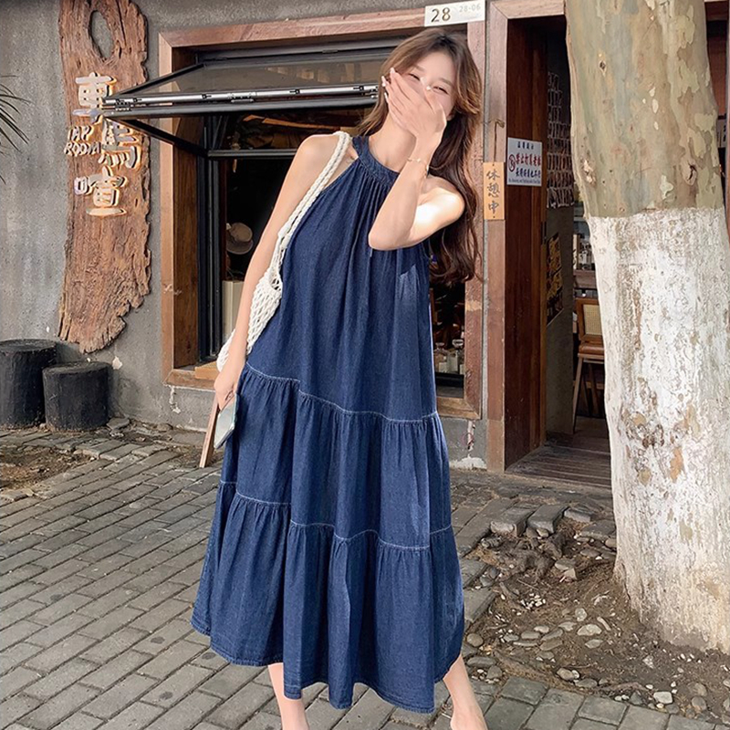 BY14507# 蓝色无袖挂脖连衣裙女中长款夏新款牛仔复古简约设计感背心裙 服裝批發女裝批發服飾貨源