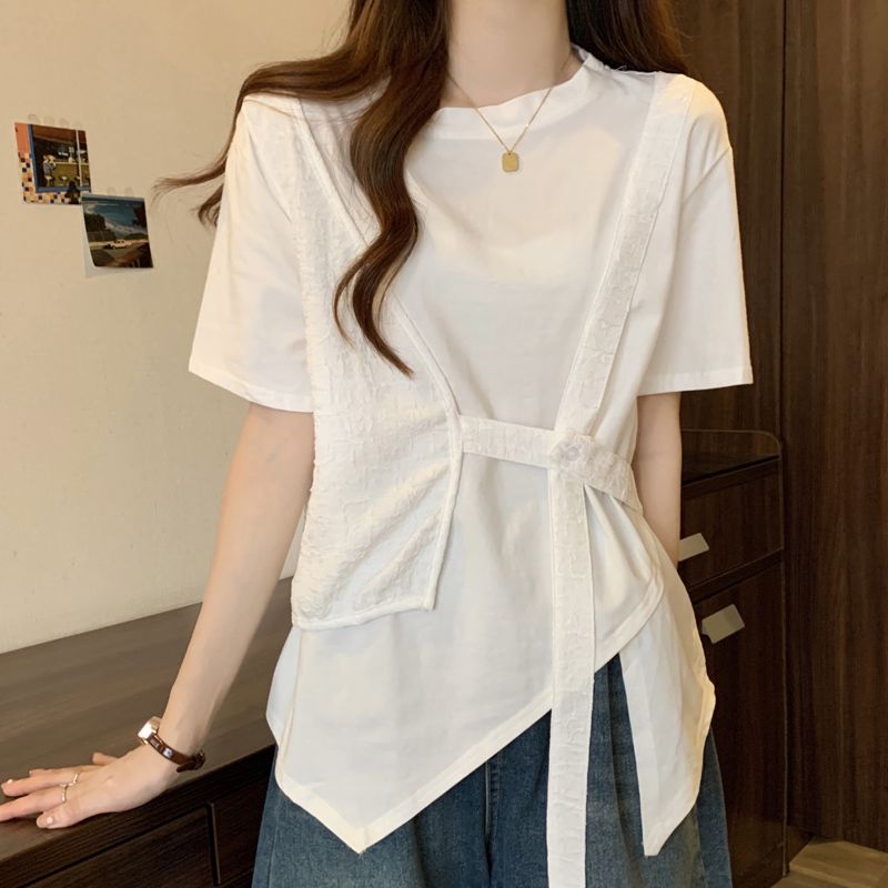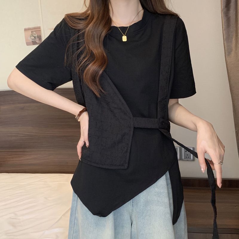 BY14527# 夏季宽松显瘦假两件不规则下摆设计圆领短袖T恤女 服裝批發女裝批發服飾貨源