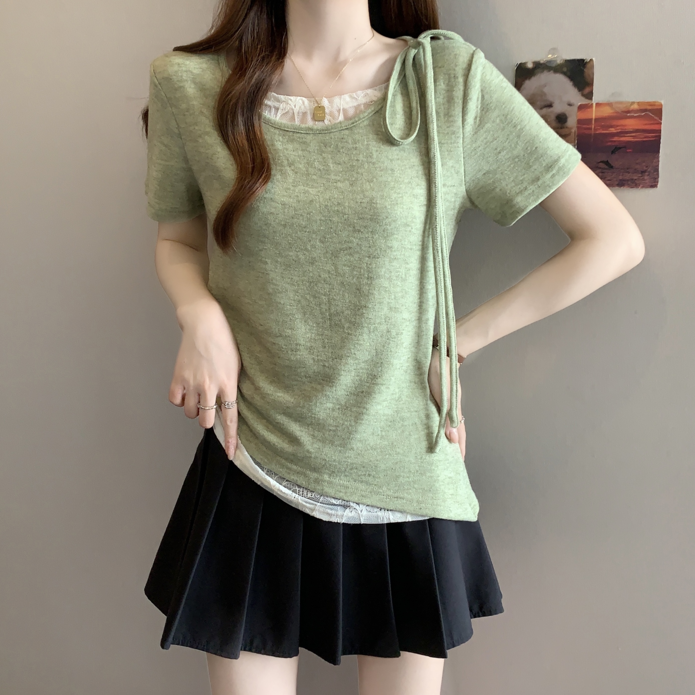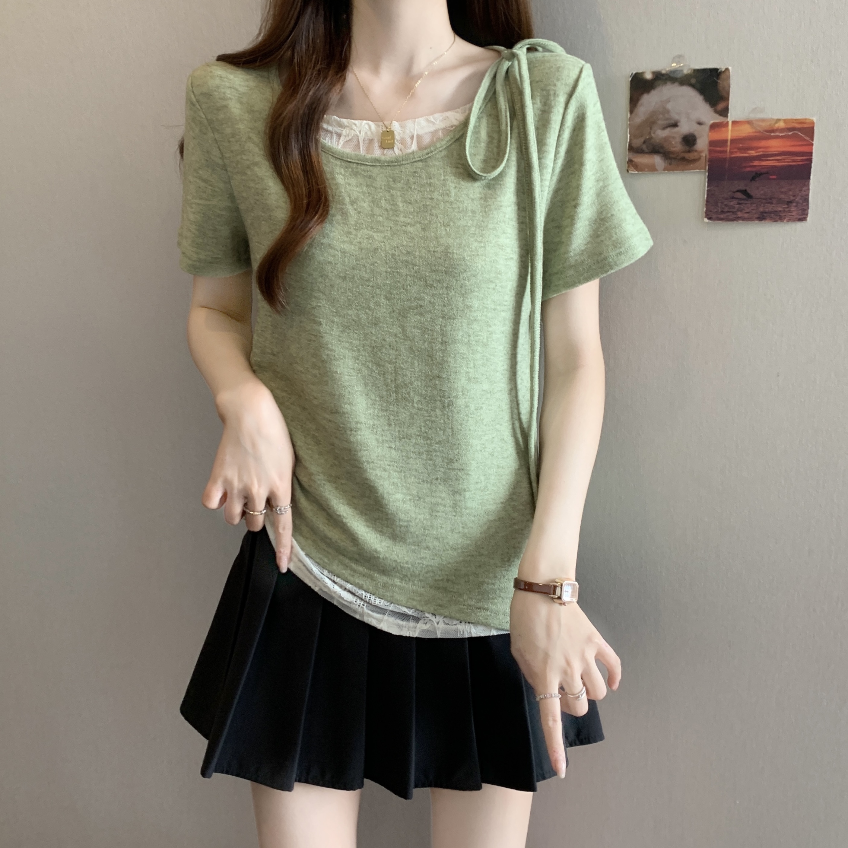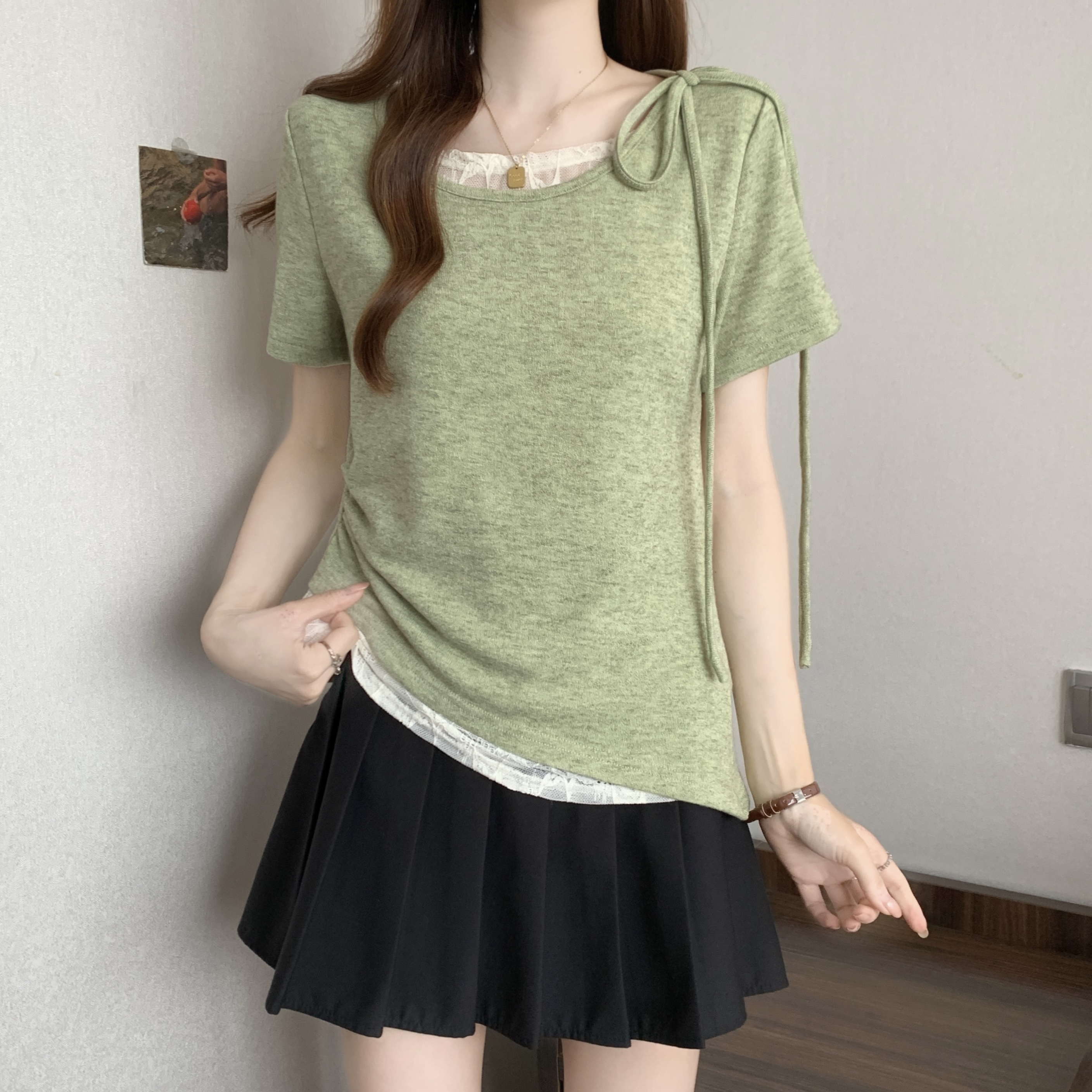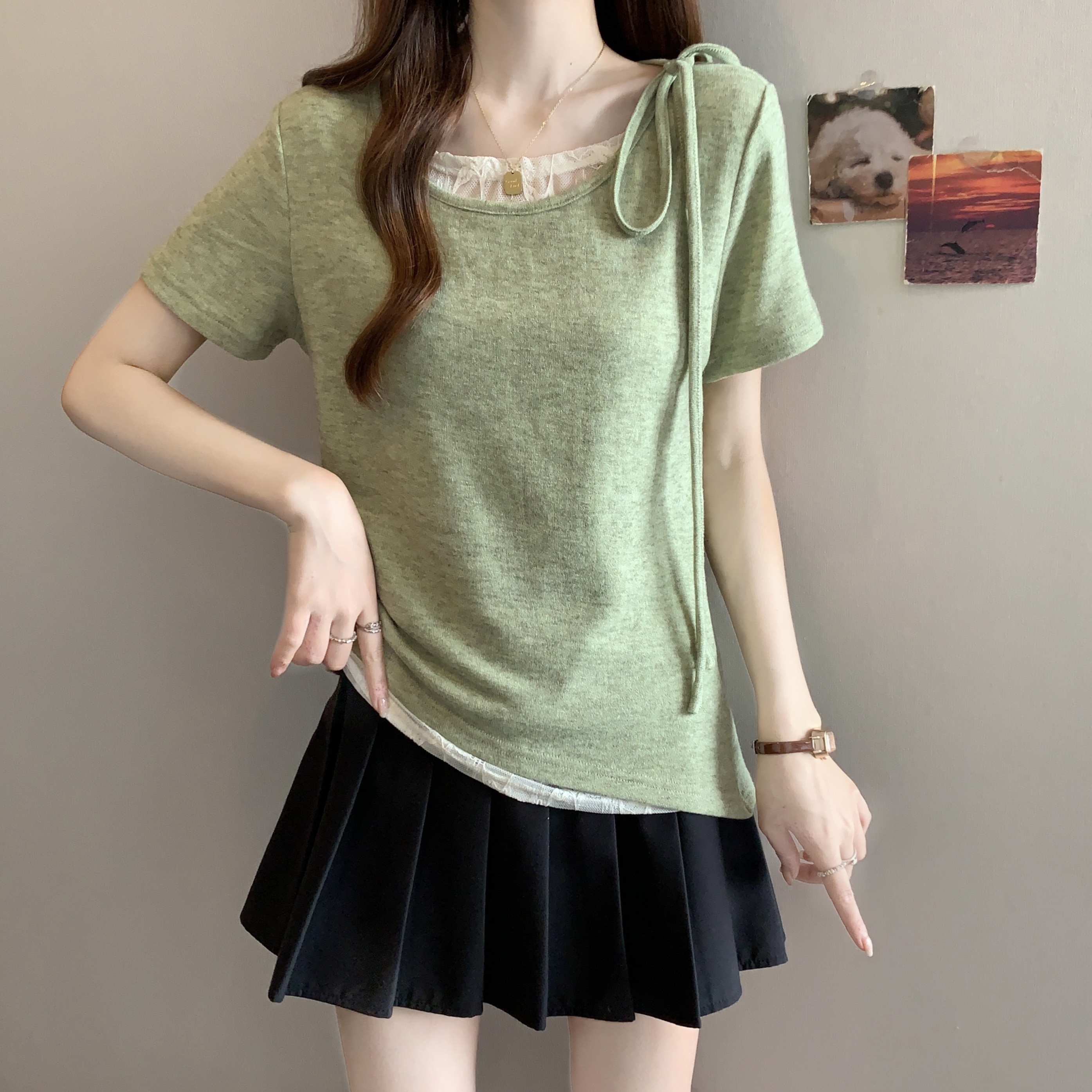 BY14570# 大码不规则短袖T恤女夏新款假两件拼接蕾丝收腰短款上 服裝批發女裝批發服飾貨源