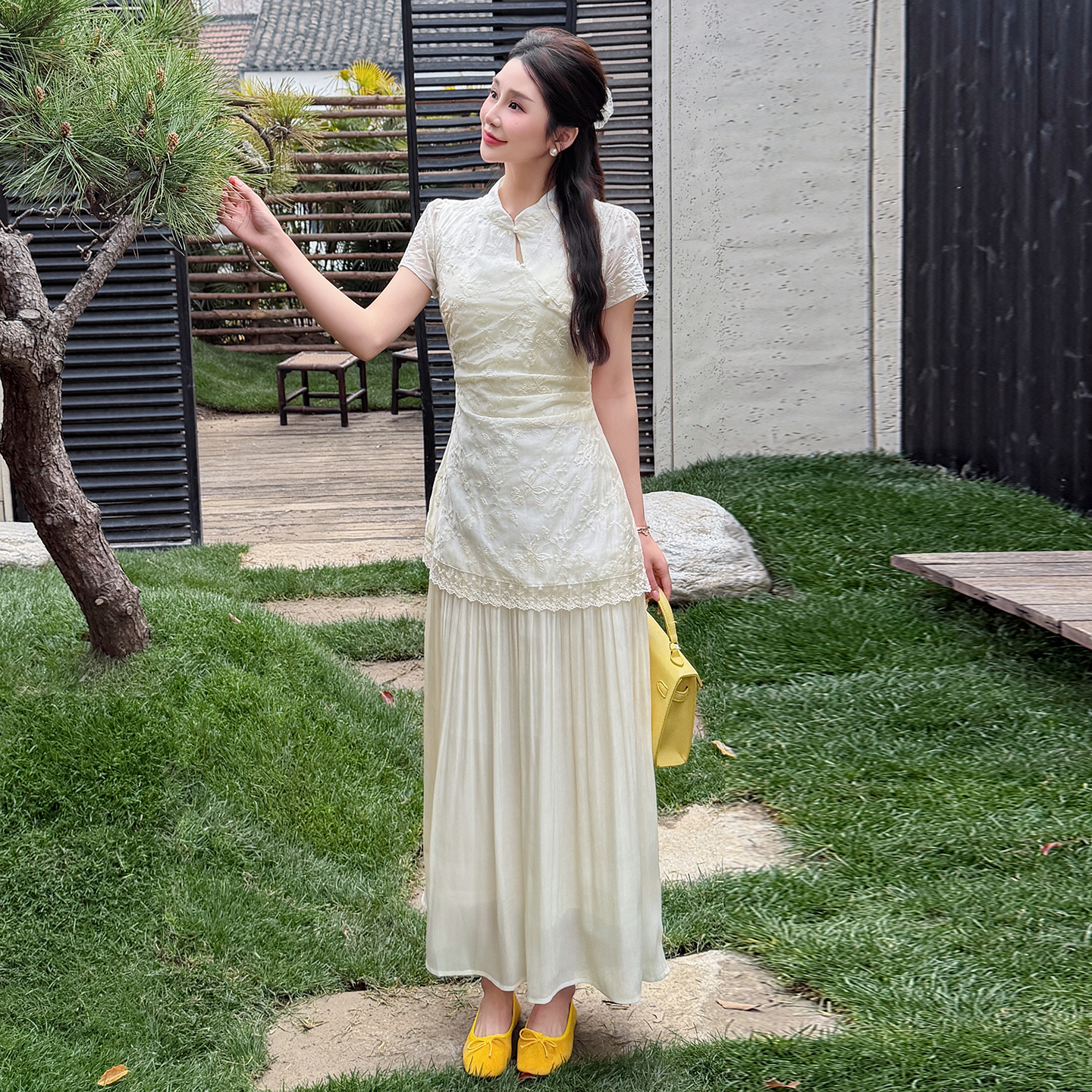 BY14589# 夏季新中式改良旗袍刺绣花边拼接气质温柔假两件大摆连衣裙 服裝批發女裝批發服飾貨源