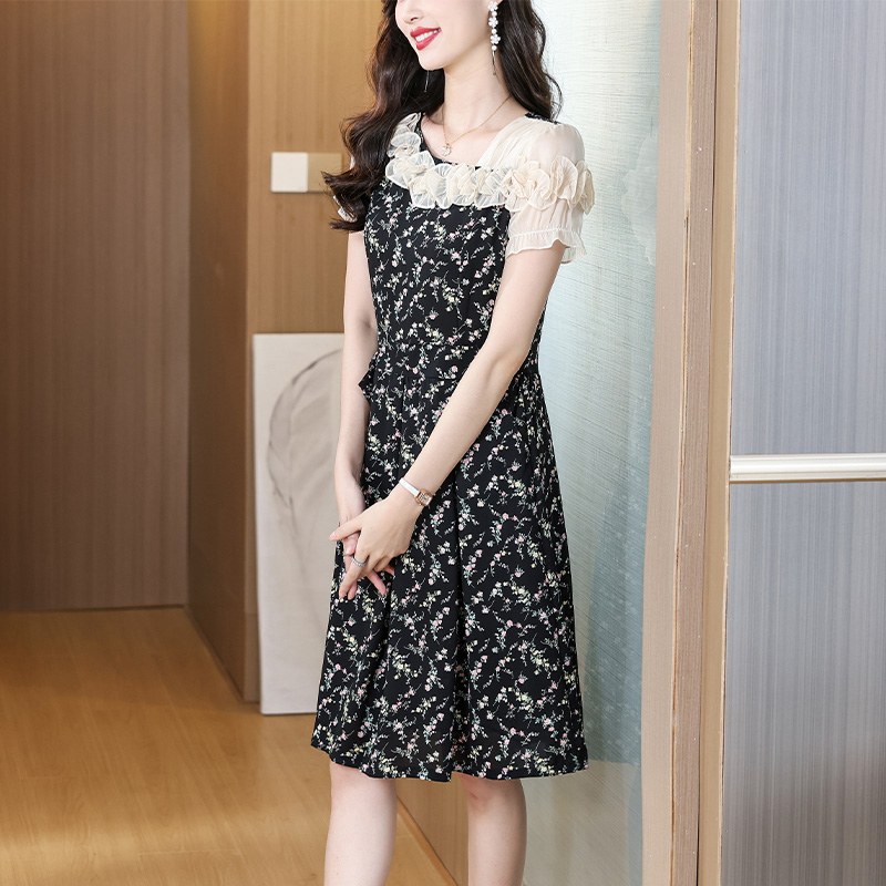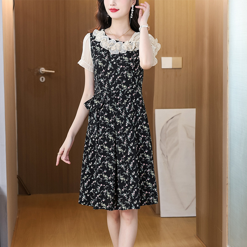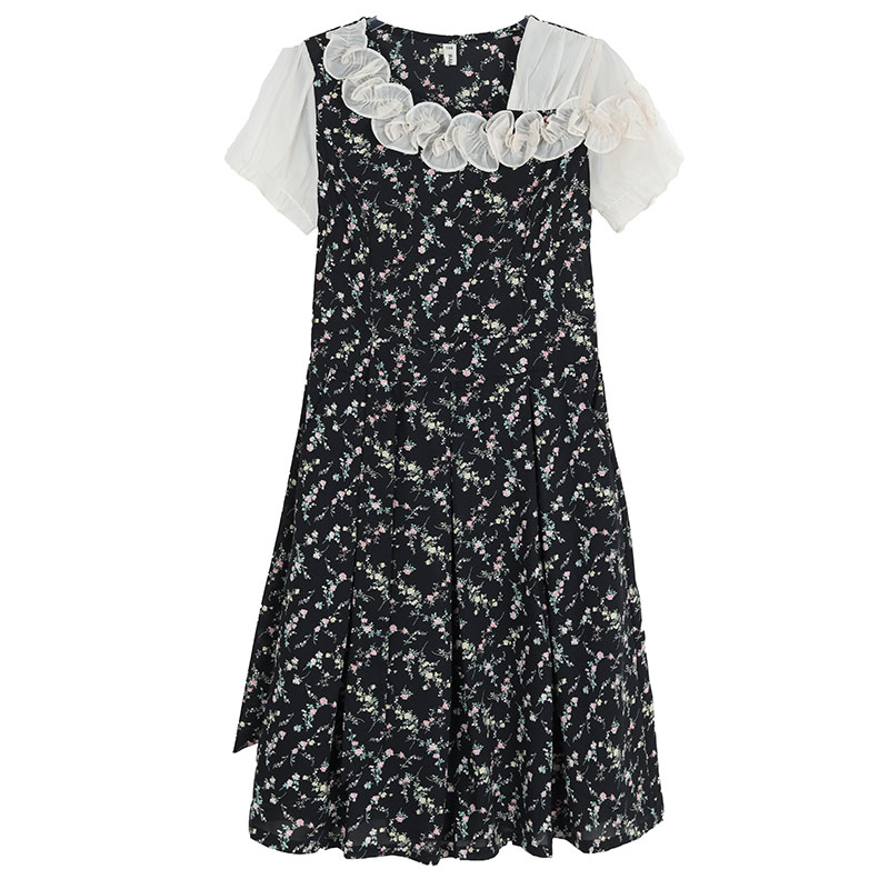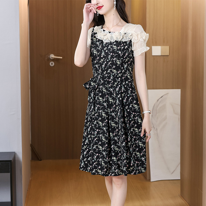 BY14597# 黑色碎花雪纺飘带连衣裙女荷叶边遮肚百搭优雅时尚甜美女装裙 服裝批發女裝批發服飾貨源