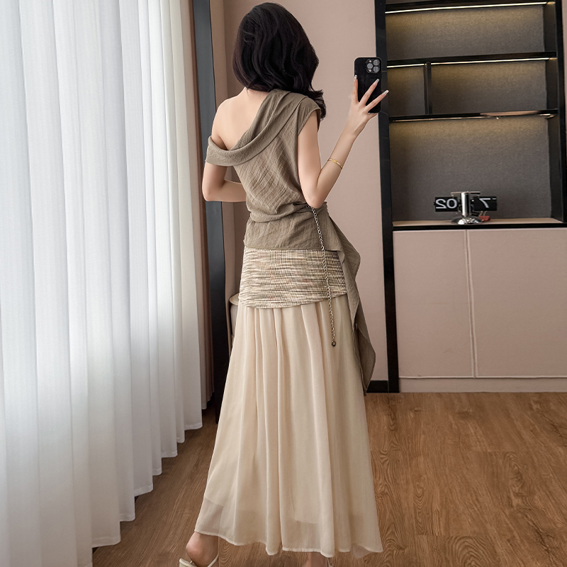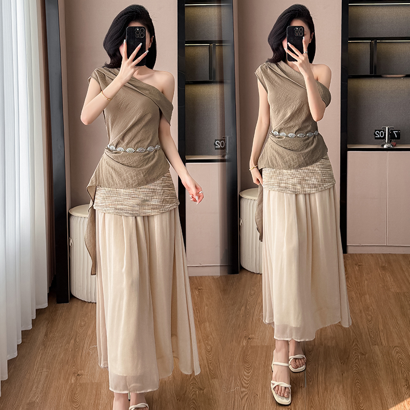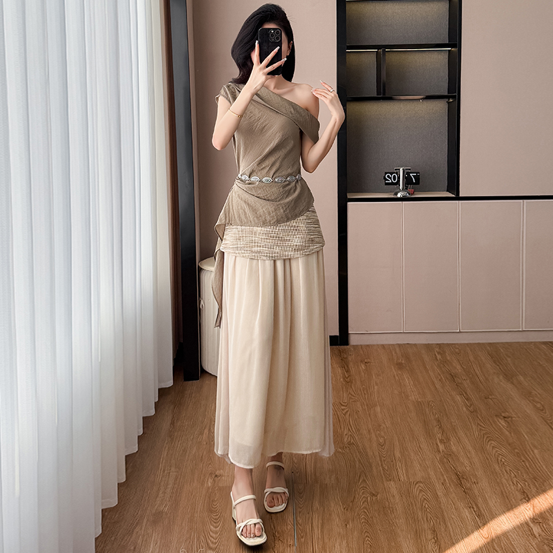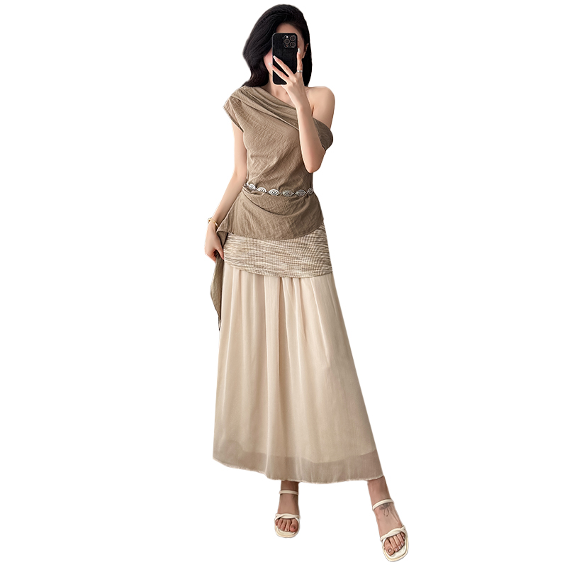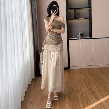 BY14600# 夏新款复古斜肩飘带设计感上衣针织拼纱半裙度假风套装女 服裝批發女裝批發服飾貨源