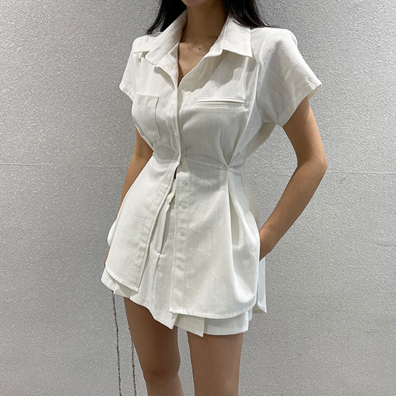 BY14609# 翻领短袖收腰衬衣式连衣裙+压褶短裙两件套 服裝批發女裝批發服飾貨源