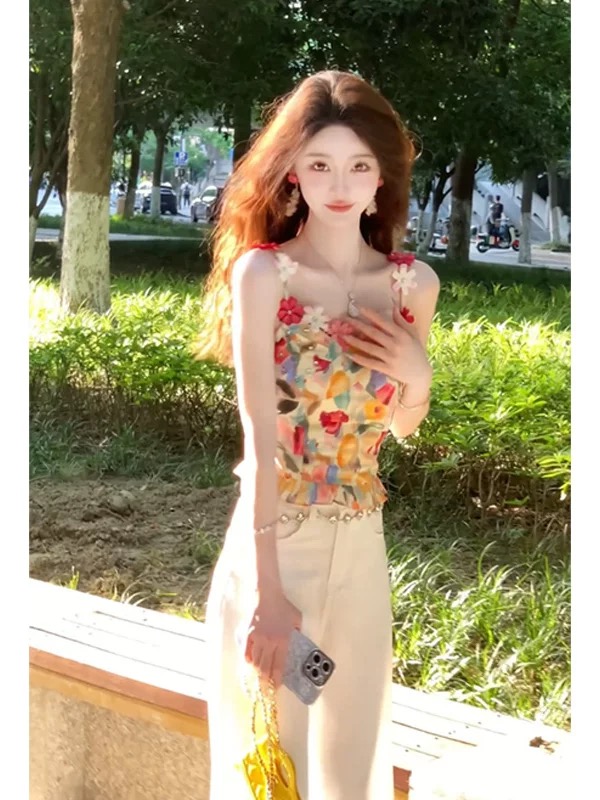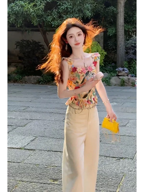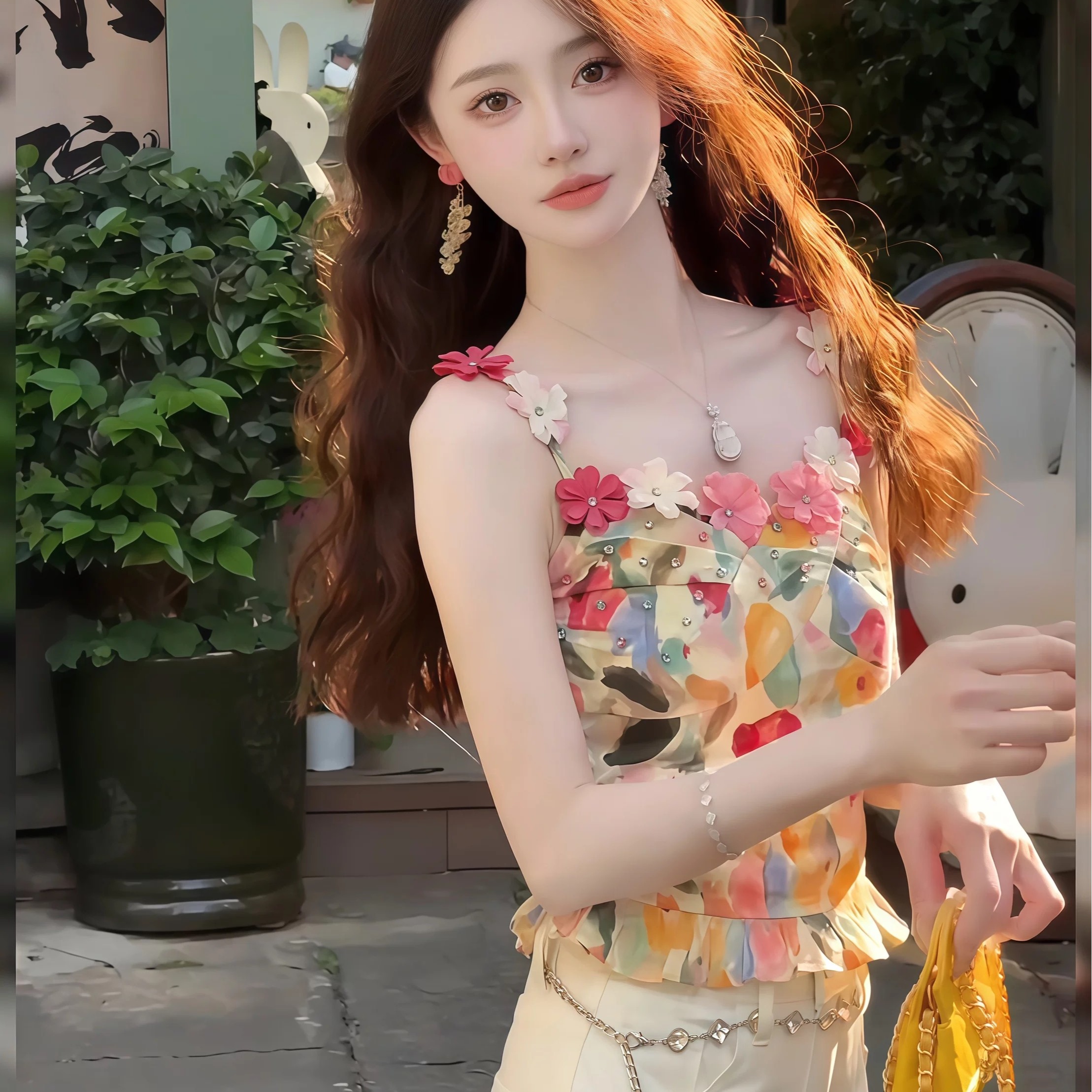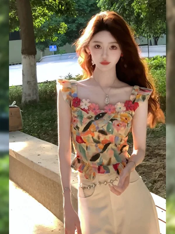 BY14624# 法式气质油画感飞飞袖修身上衣夏季新款辣妹掐腰漂亮小衫女装 服裝批發女裝批發服飾貨源