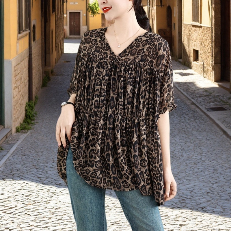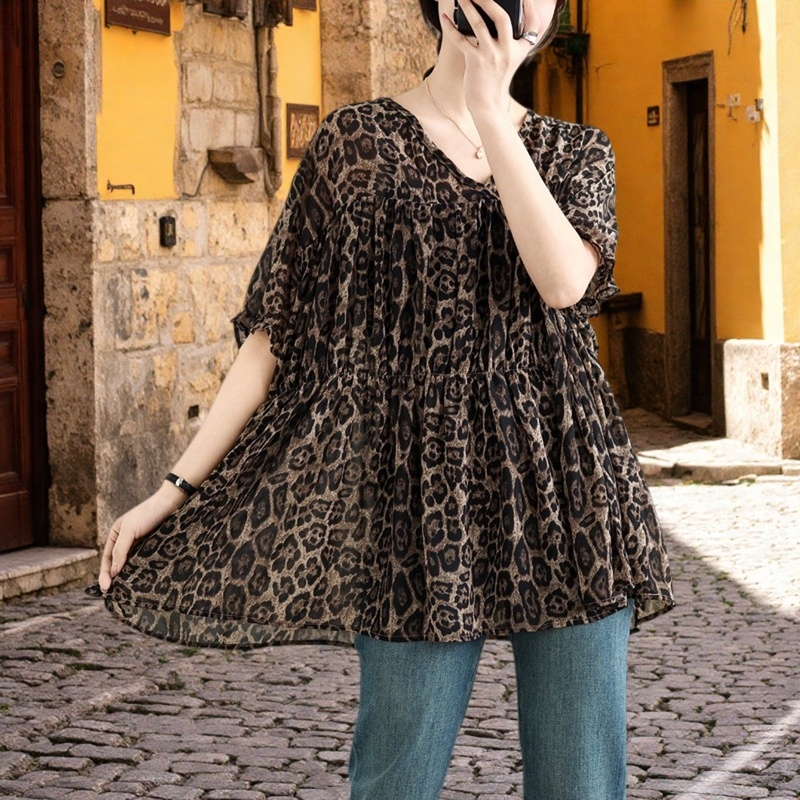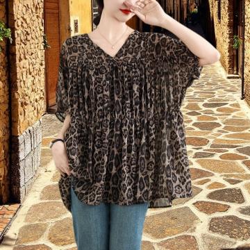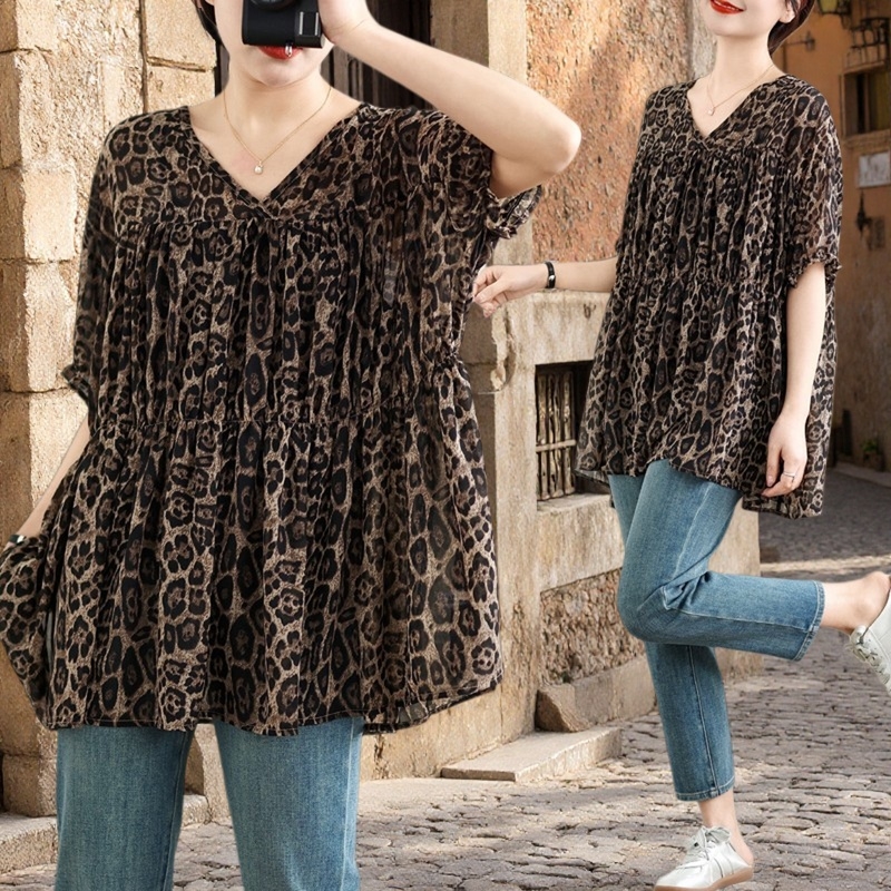 BY14715# 复古时尚胖MM夏季新款豹纹收腰V领韩版减龄娃娃衫 服裝批發女裝批發服飾貨源