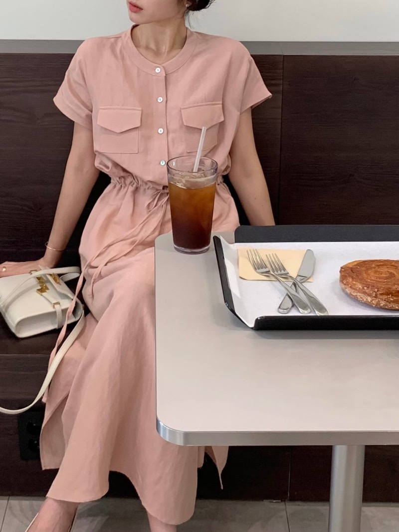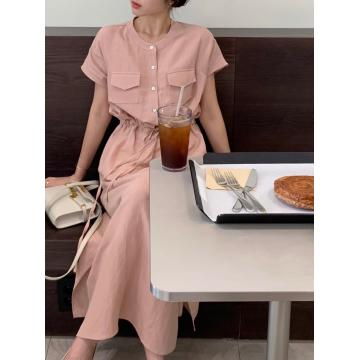 BY14716# chic韩版收腰抽绳侧开叉连衣裙 服裝批發女裝批發服飾貨源