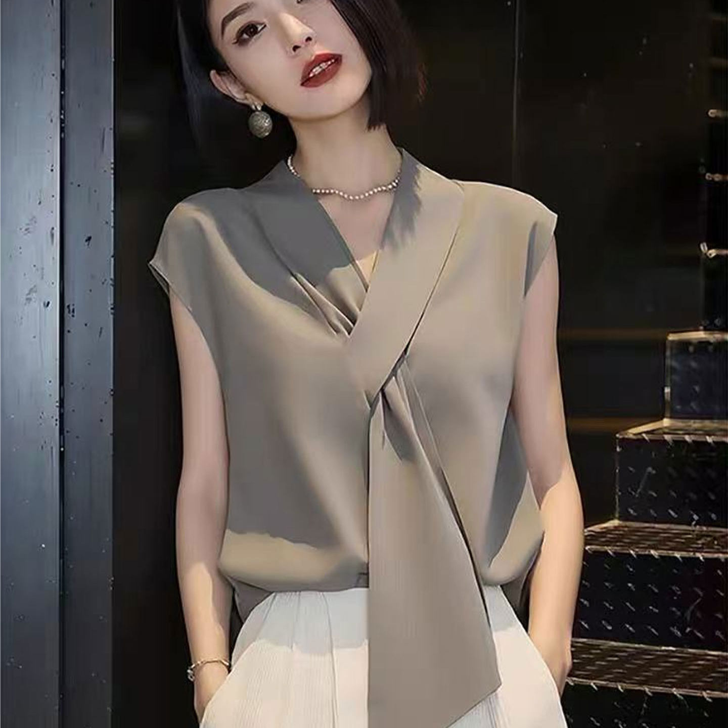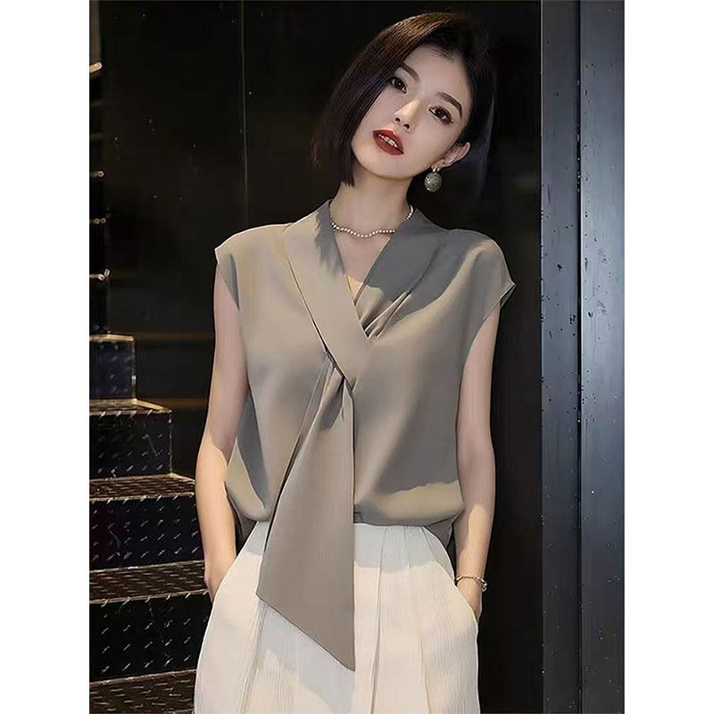 BY14721# 轻熟优雅风无袖V领飘带衬衫女夏季新款休闲百搭显瘦减龄上衣 服裝批發女裝批發服飾貨源