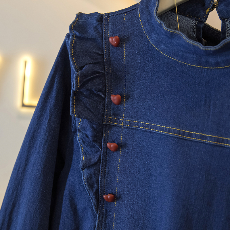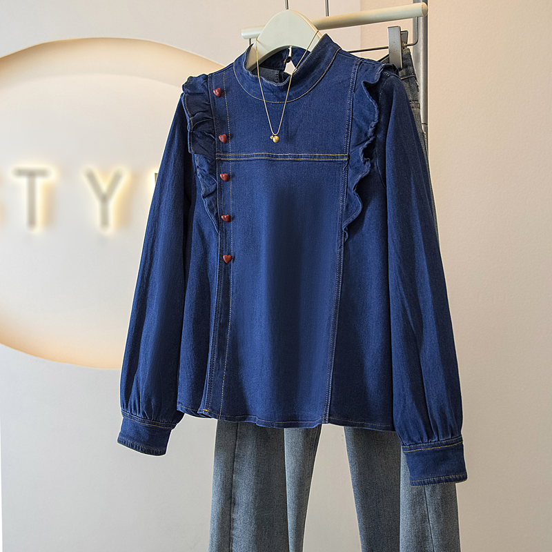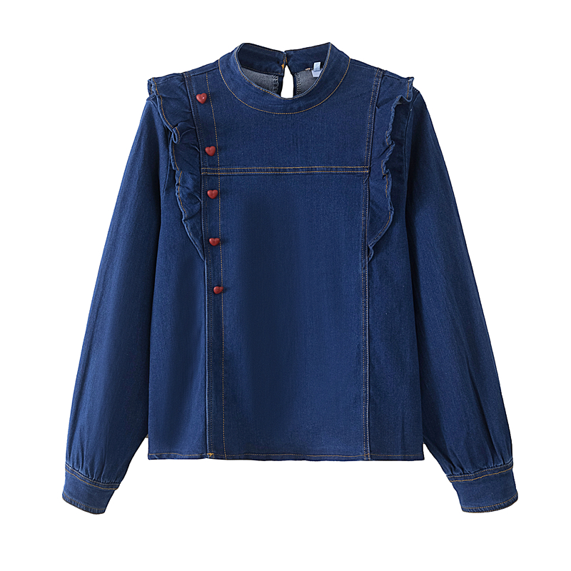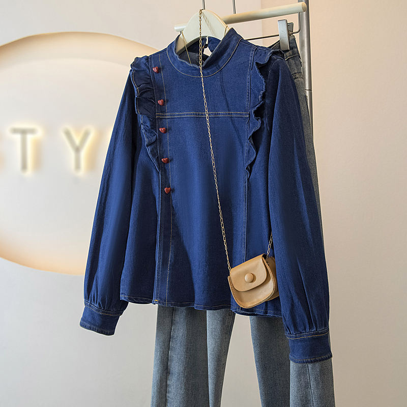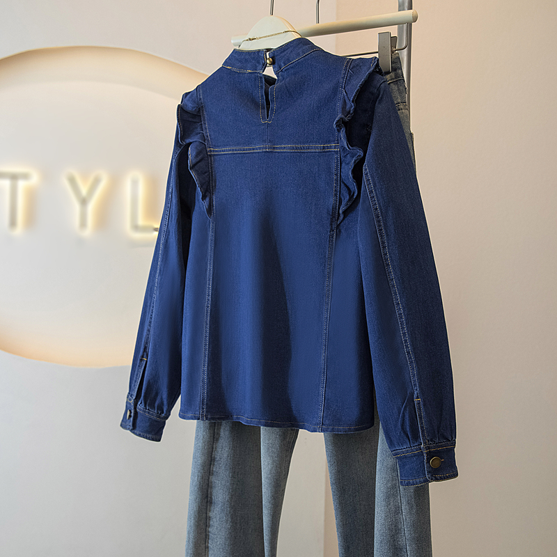 BY14729# 韩系复古舒适深蓝色牛仔风长袖上衣女春季新款气质通勤穿搭 服裝批發女裝批發服飾貨源