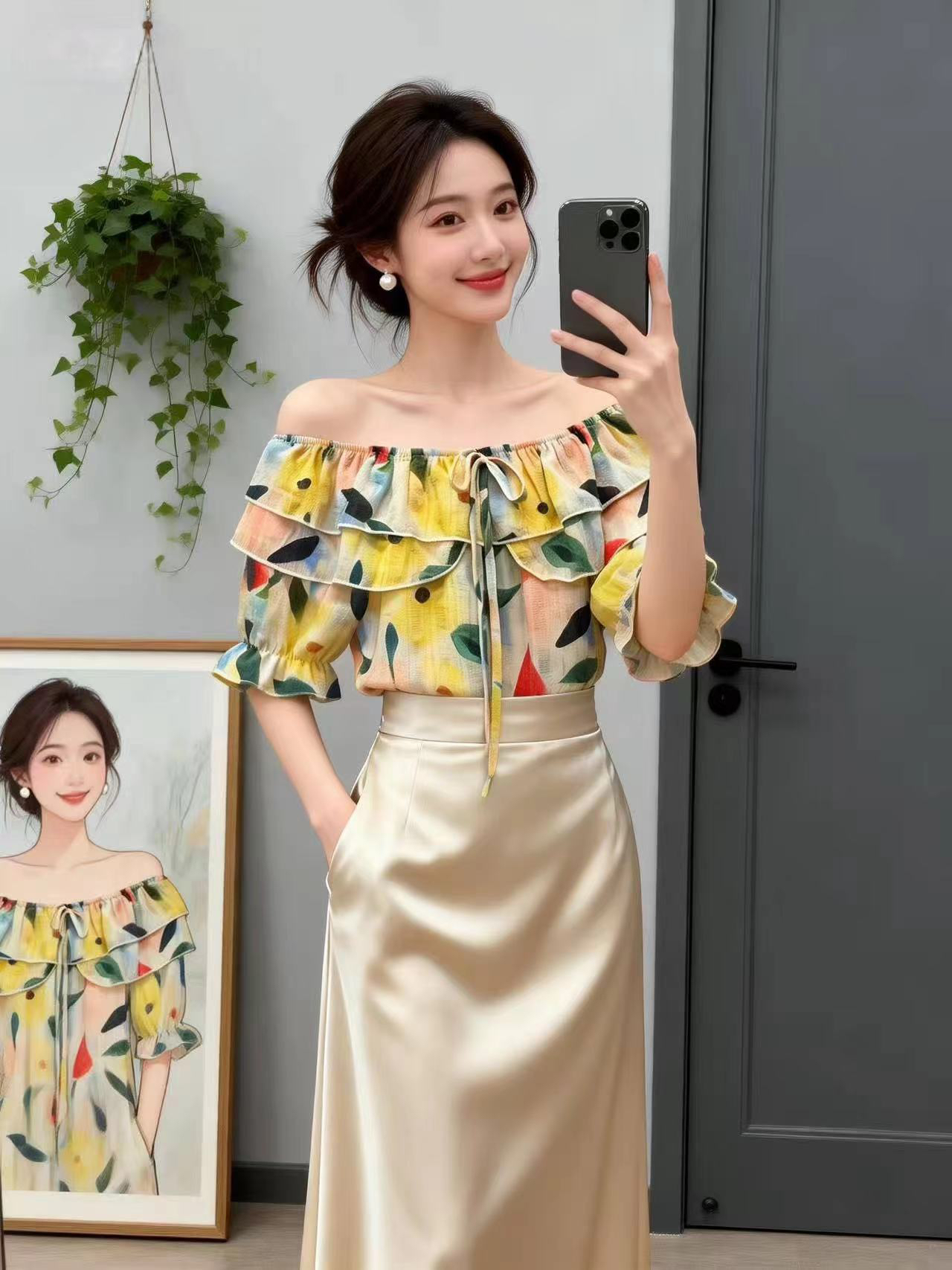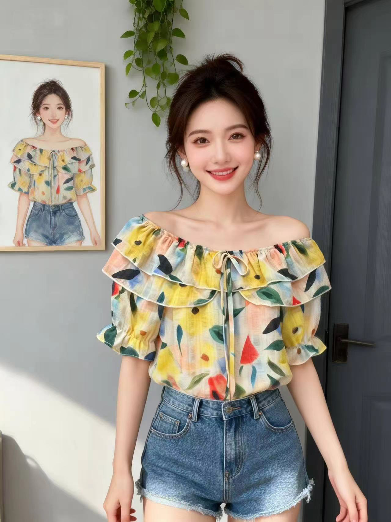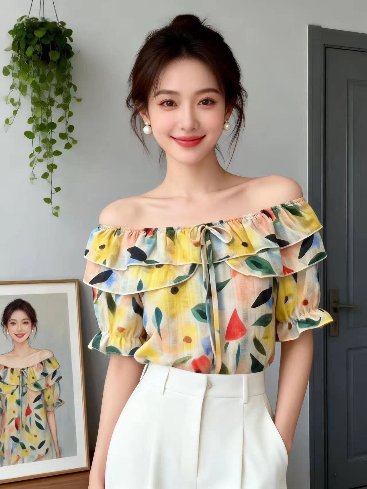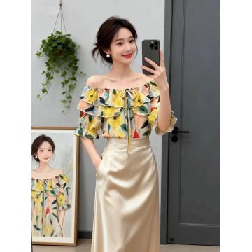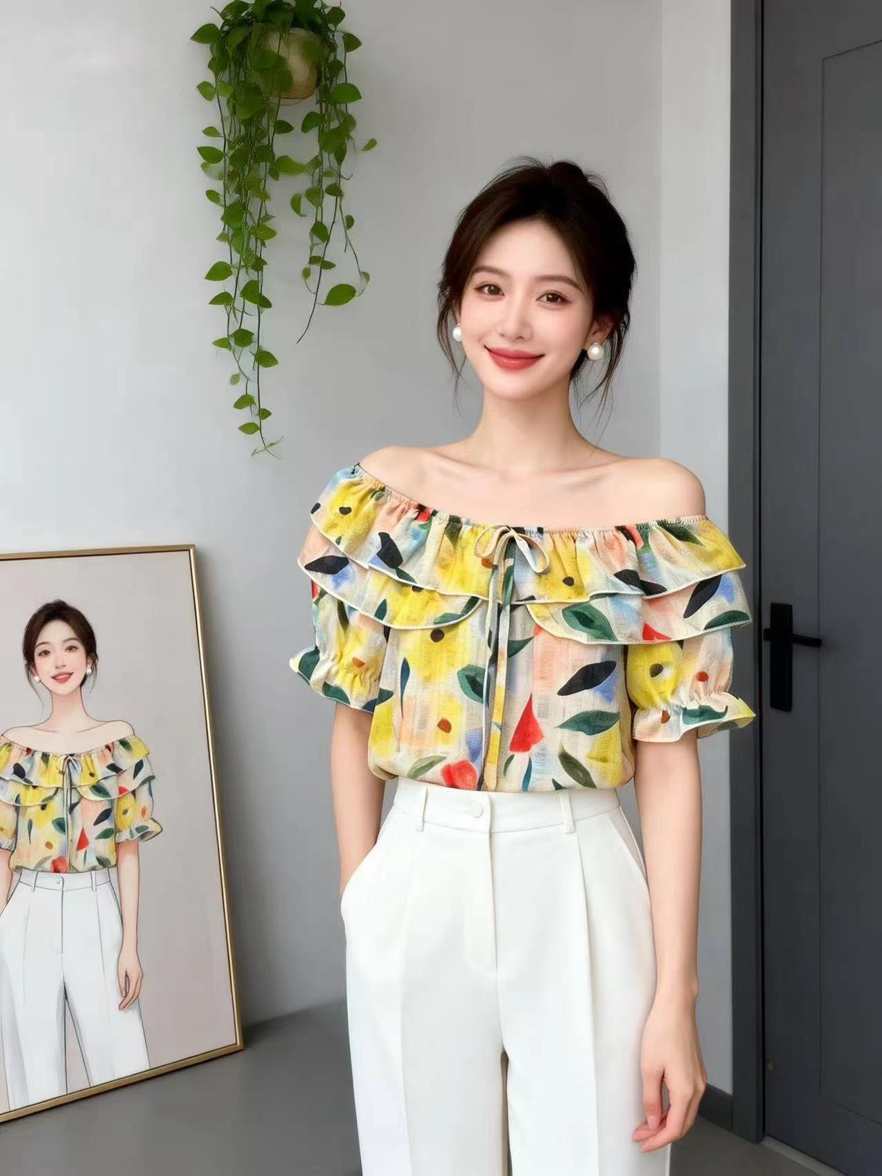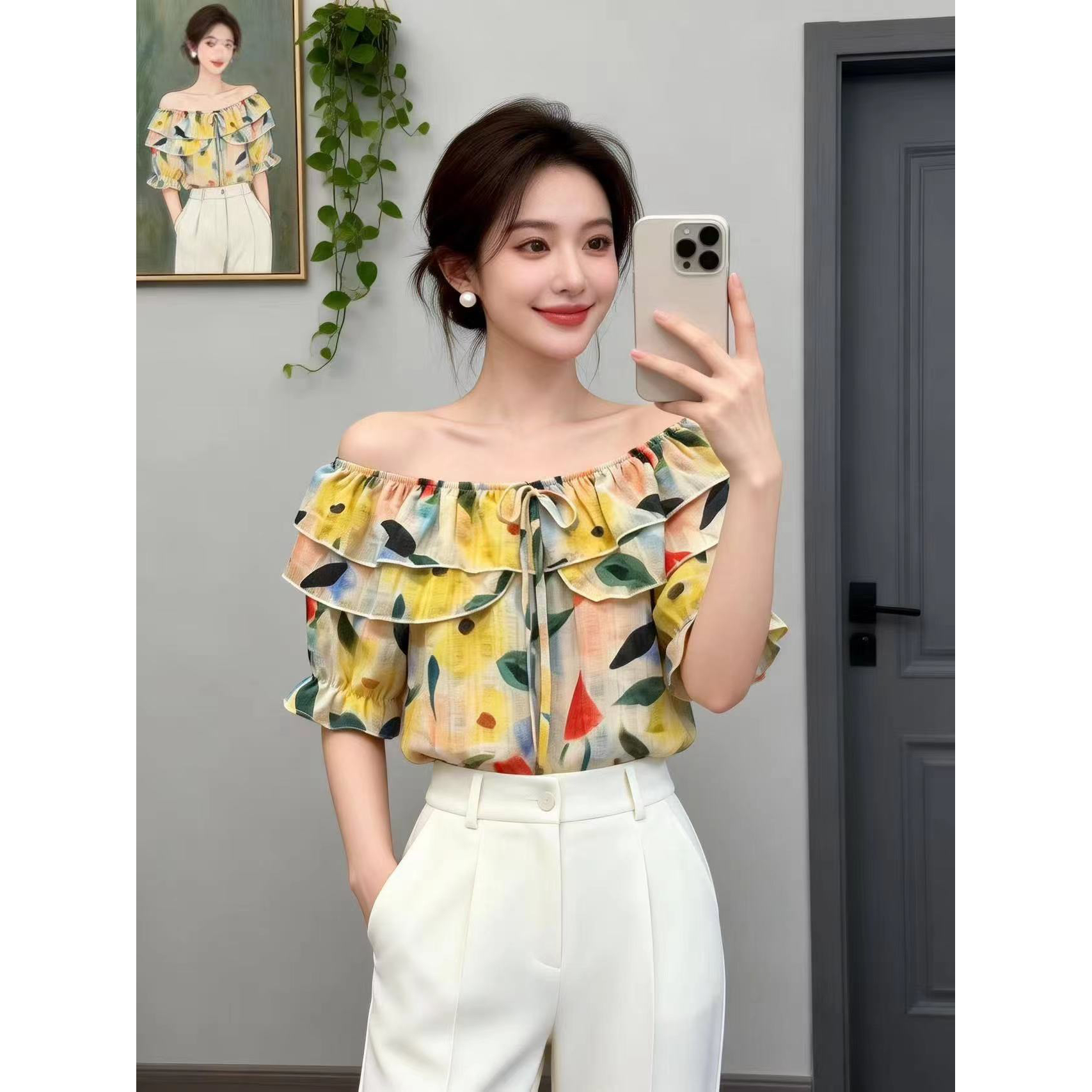 BY14737# 夏季新款一字肩荷叶边领花色冰丝雪纺衬衣小衫女甜美减龄上衣 服裝批發女裝批發服飾貨源