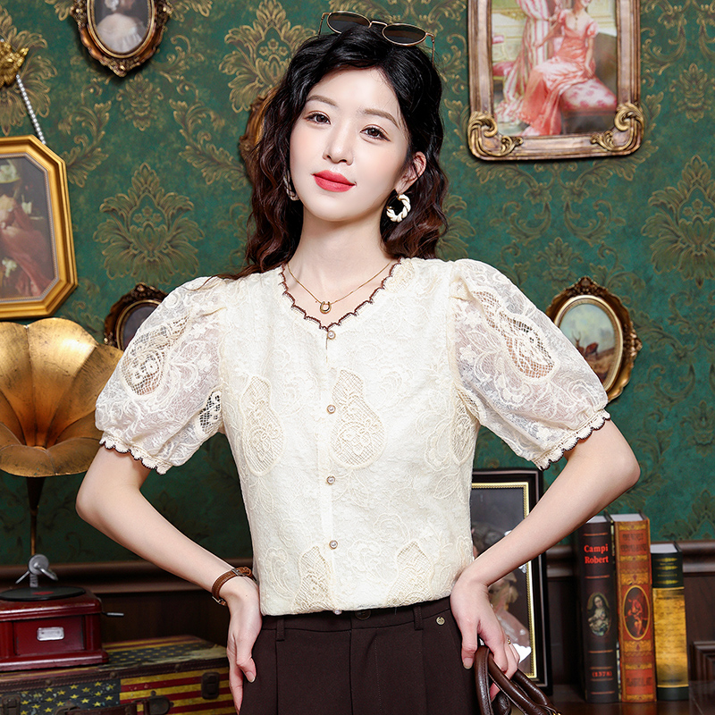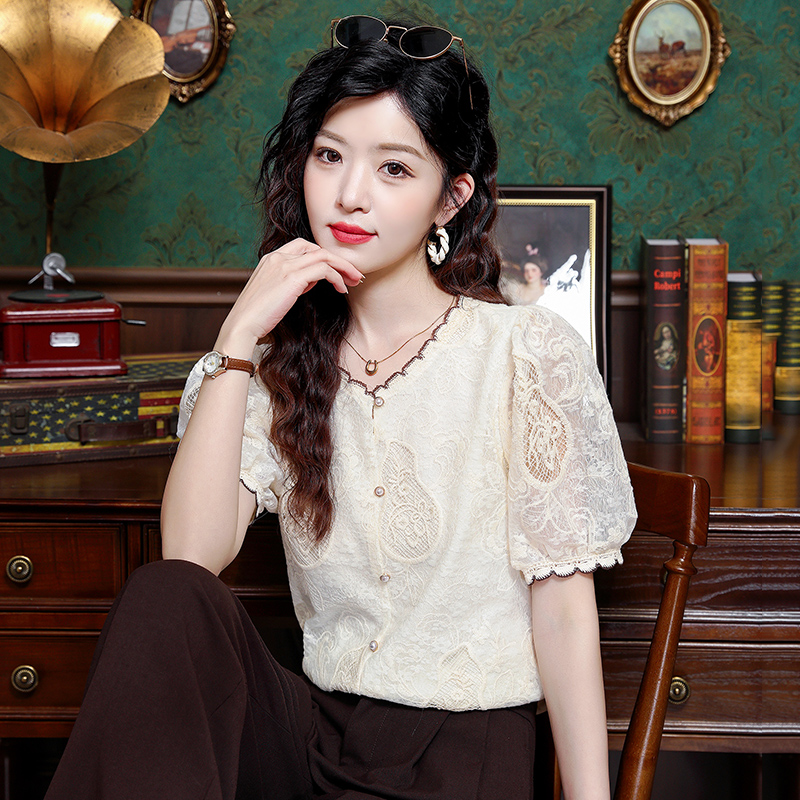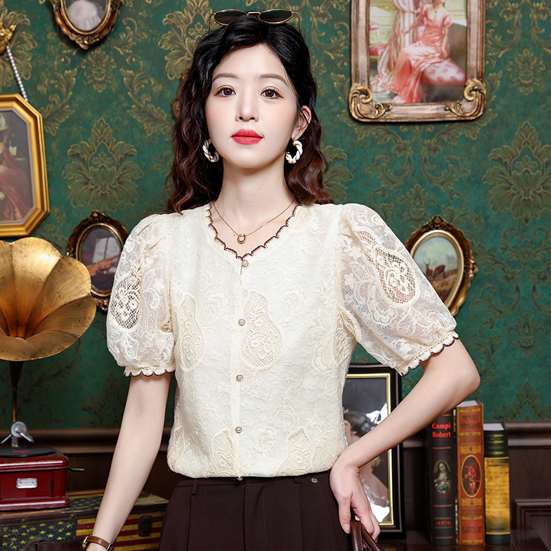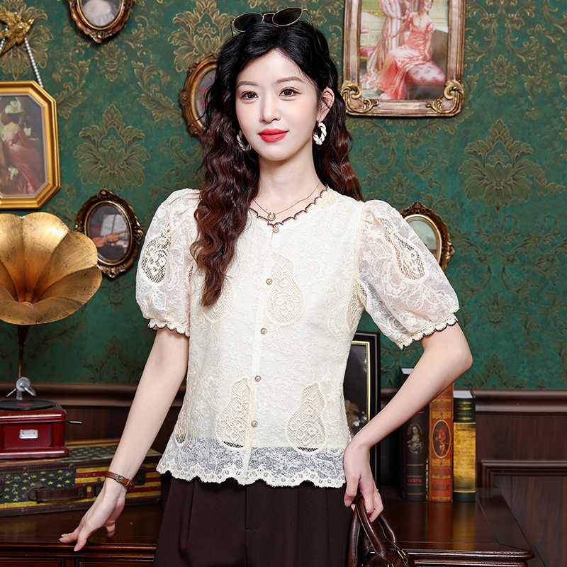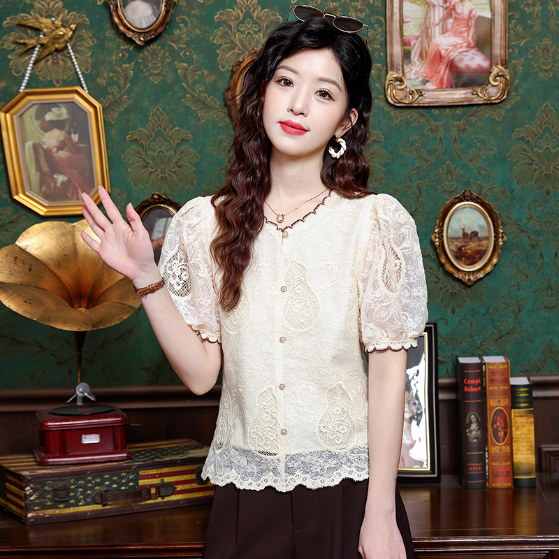 BY14769# 夏季新款法式宫廷重工立体刺绣钩花短袖上衣衬衫 服裝批發女裝批發服飾貨源