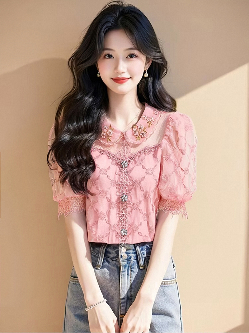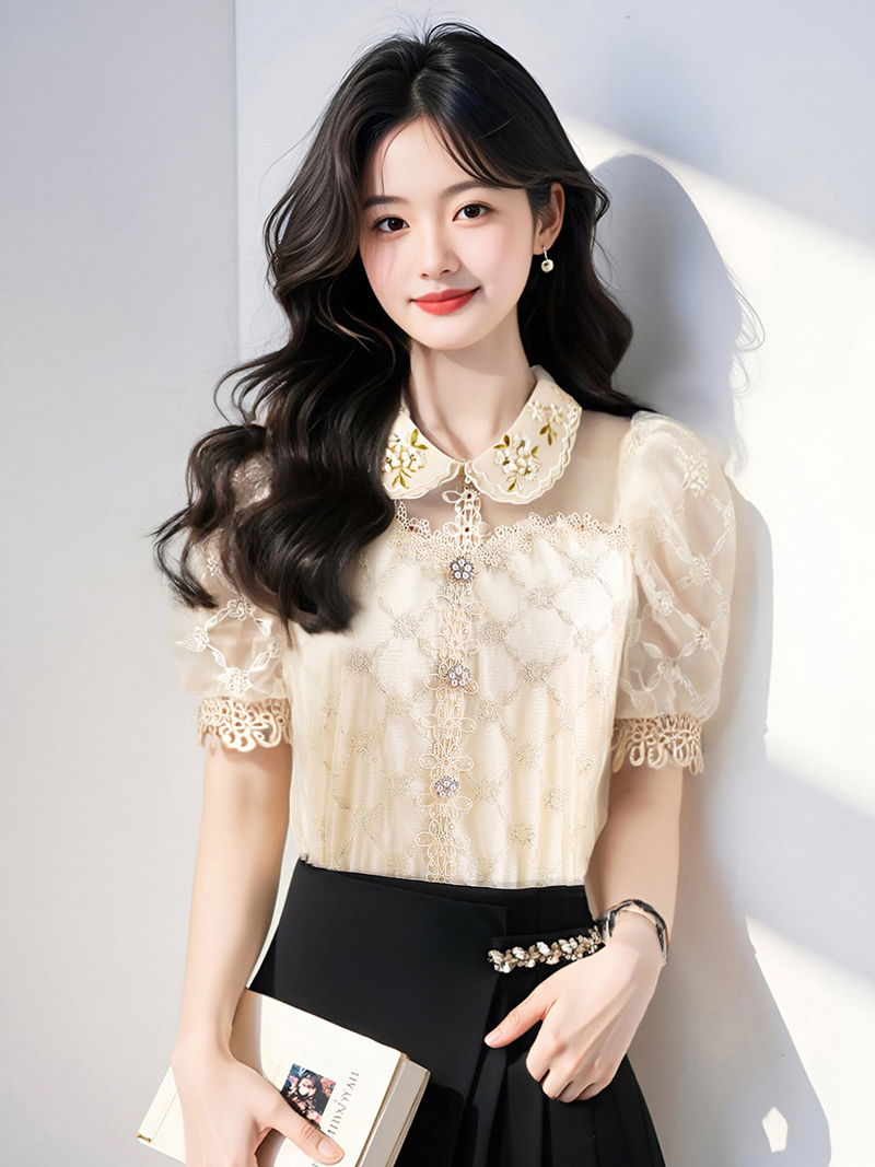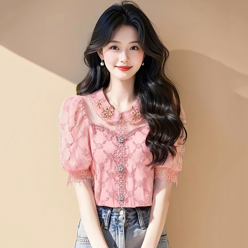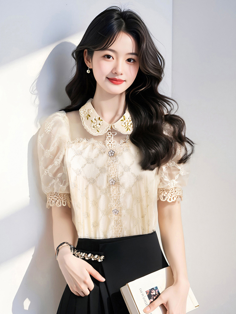 BY14773# 夏季重工刺绣钉珠镂空设计感小众别致蕾丝短袖上衣衬衫女 服裝批發女裝批發服飾貨源