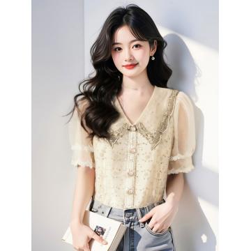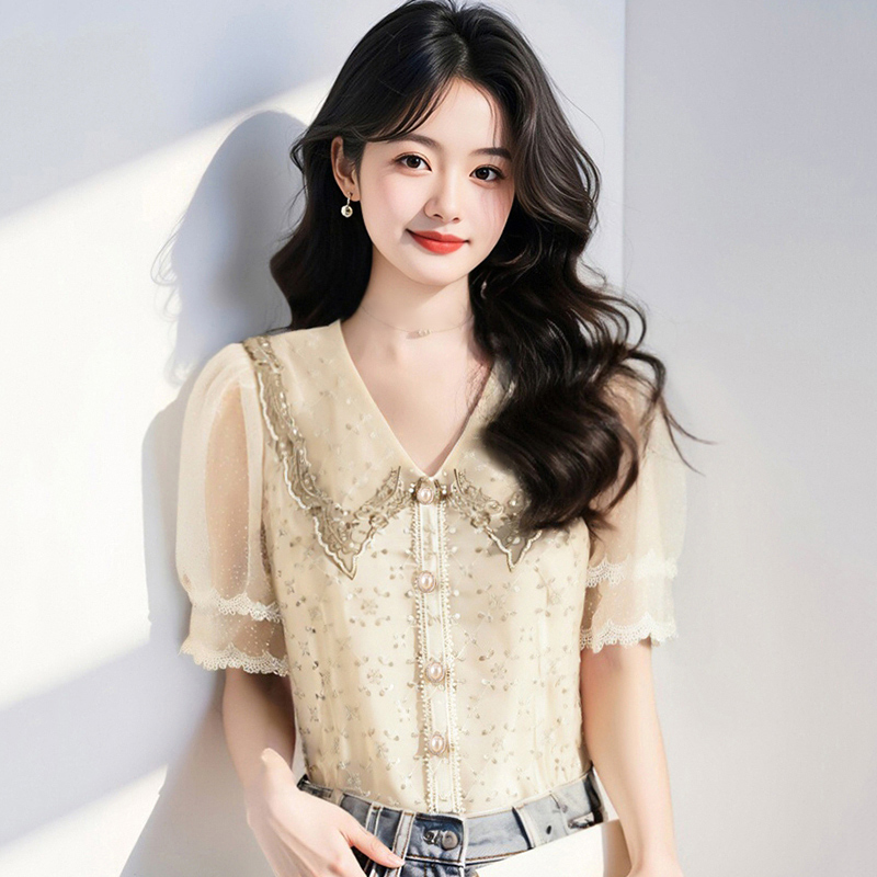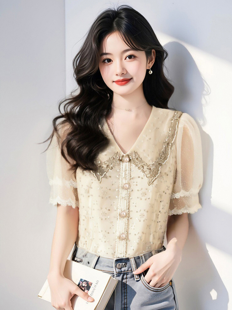 BY14774# 夏季重工刺绣钉珠镂空设计感小众别致蕾丝短袖上衣衬衫女 服裝批發女裝批發服飾貨源