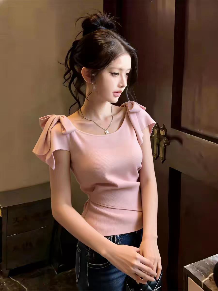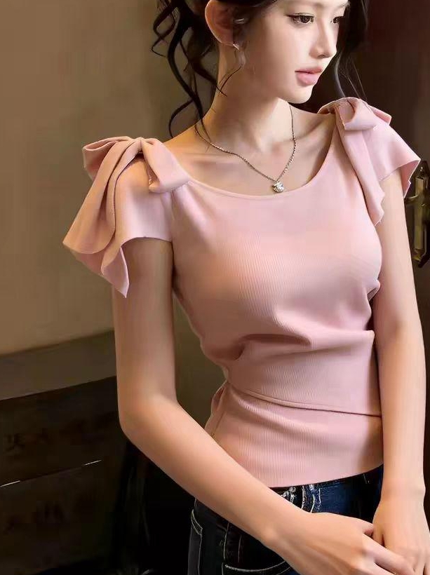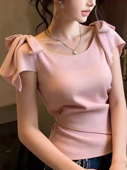 BY14780# 超减龄蝴蝶结系带设计粉色上衣春季女装新款圆领修身别致短袖 服裝批發女裝批發服飾貨源