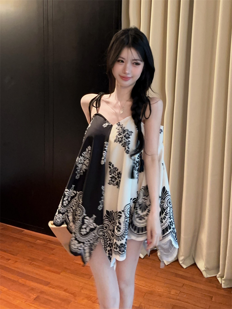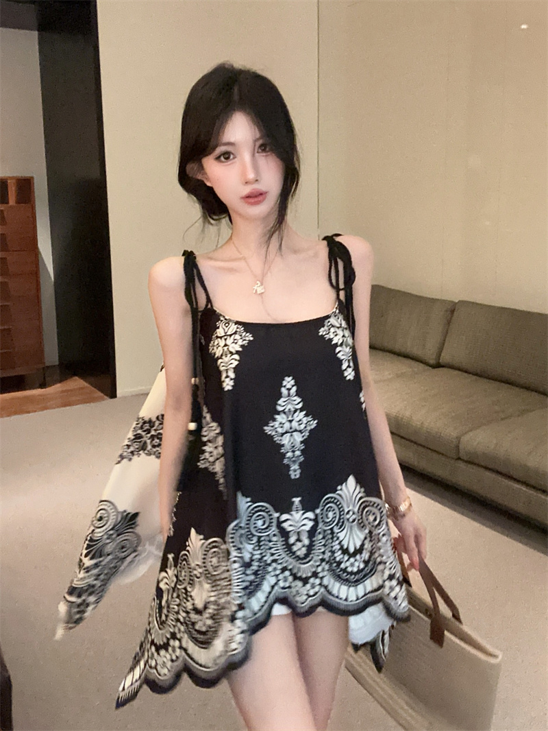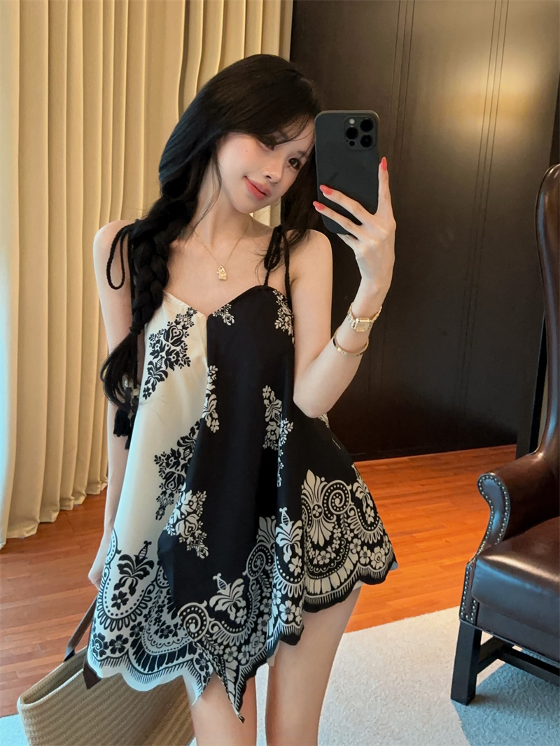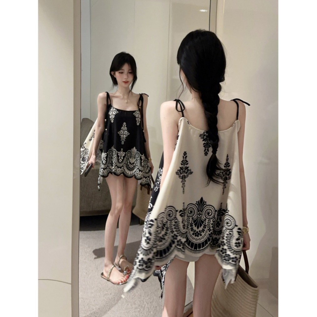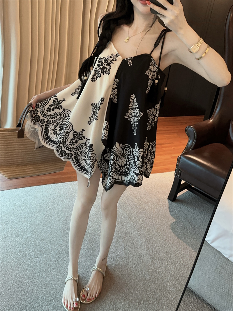 BY14785# 度假民族风复古印花撞色不规则宽松吊带上衣两面穿 服裝批發女裝批發服飾貨源