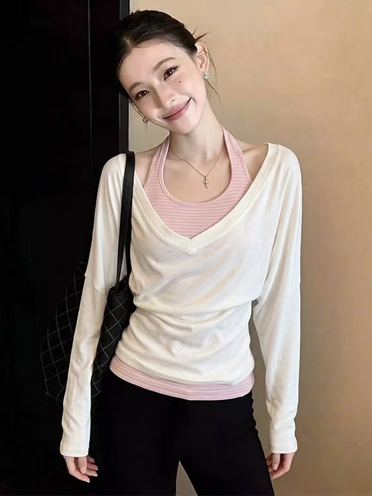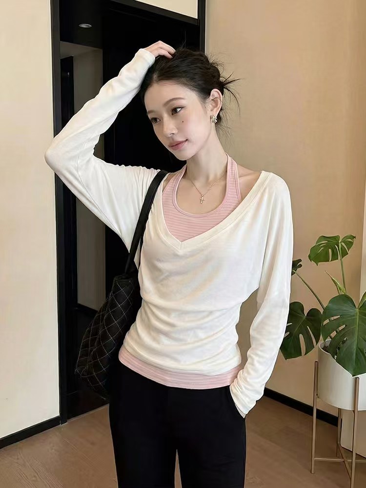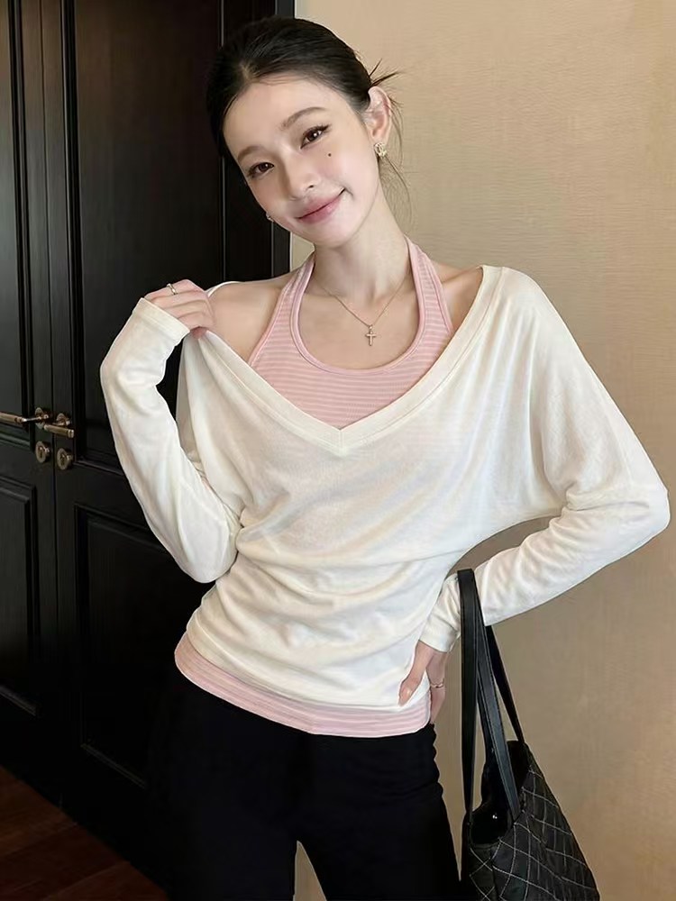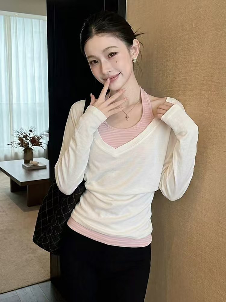 BY14793# 韩系甜美风白色罩衫条纹背心两件套春夏新款时尚宽松百搭套装 服裝批發女裝批發服飾貨源