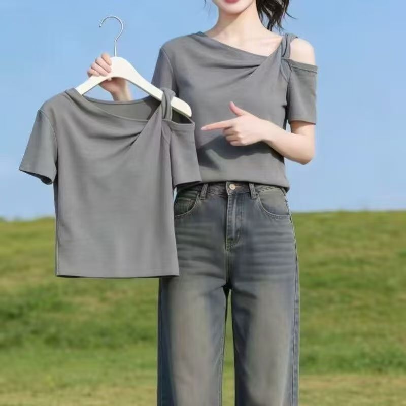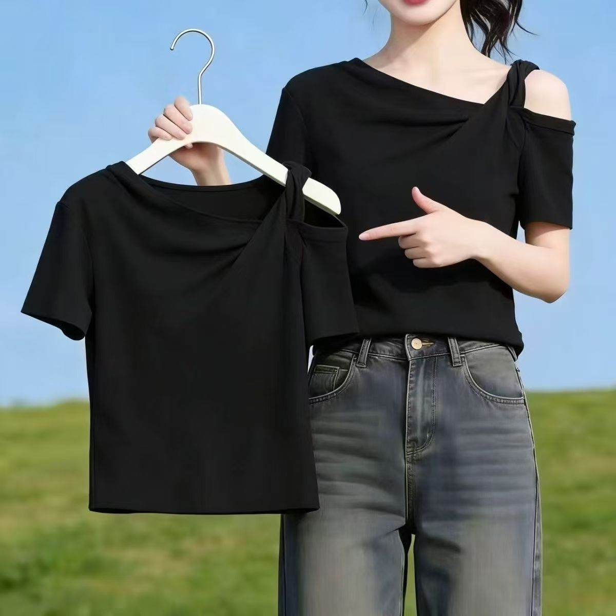 BY14795# 不规则斜领露肩夏短袖T恤女显瘦上衣 服裝批發女裝批發服飾貨源