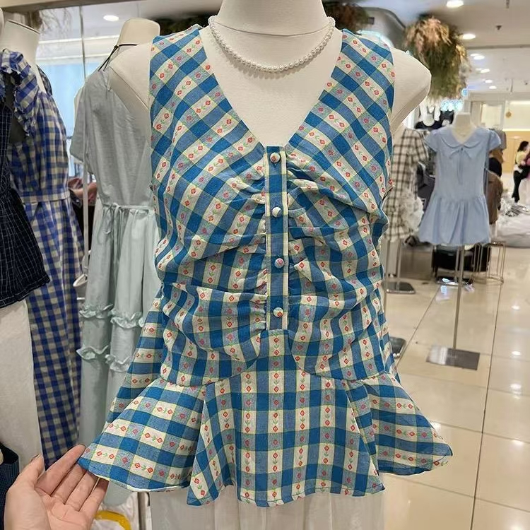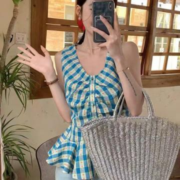 BY14798# 复古格子小背心女新款夏季遮肉显瘦小衫外穿无袖上衣 服裝批發女裝批發服飾貨源