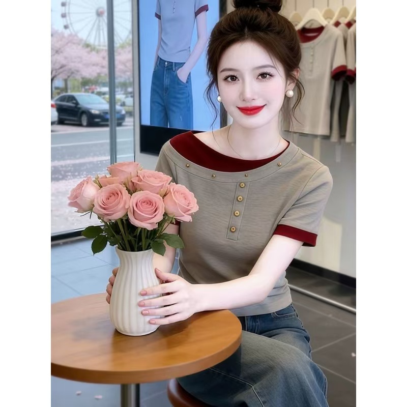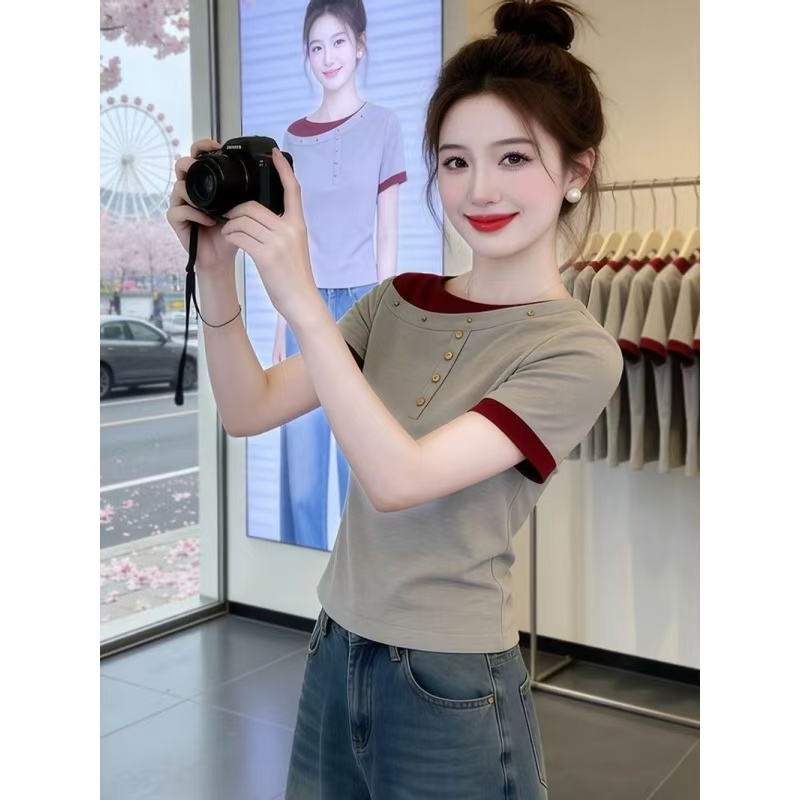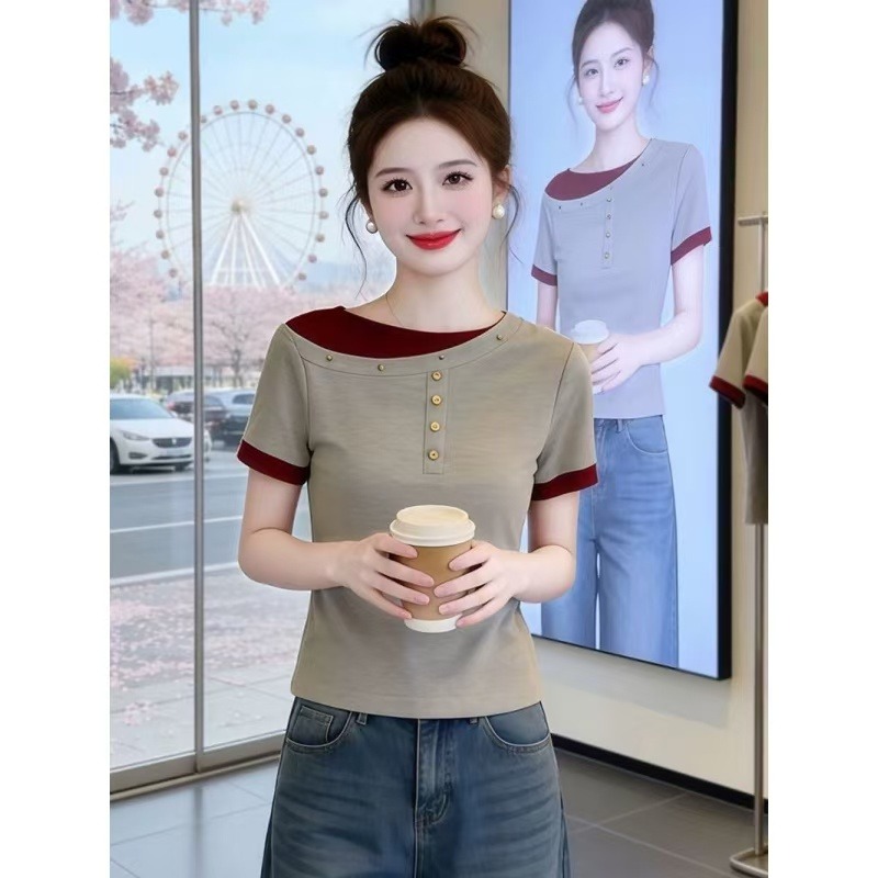 BY14802# 撞色假两件斜肩夏拼接短袖T恤女 服裝批發女裝批發服飾貨源