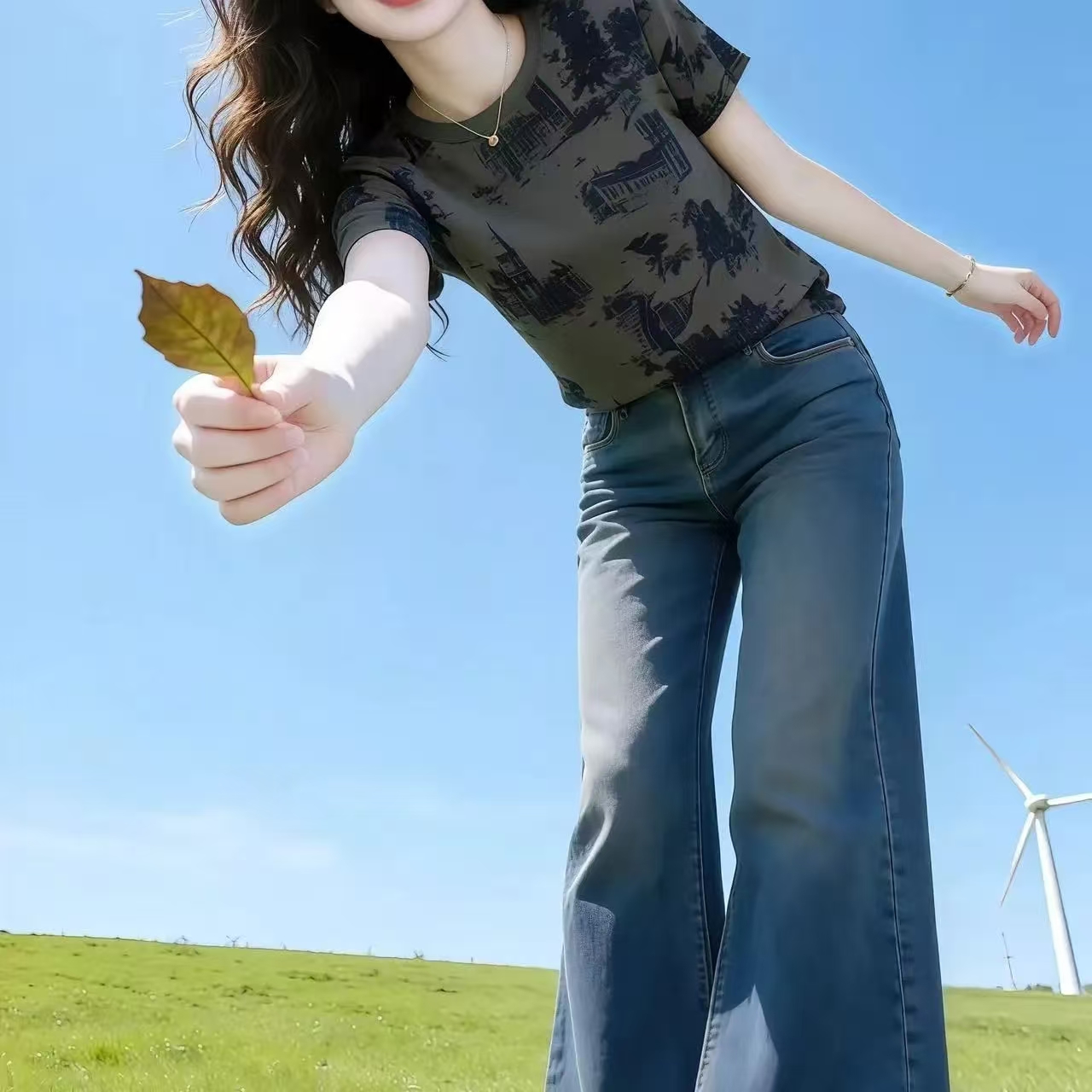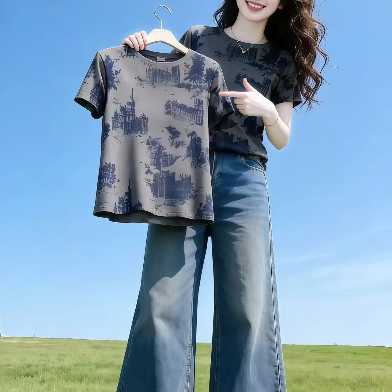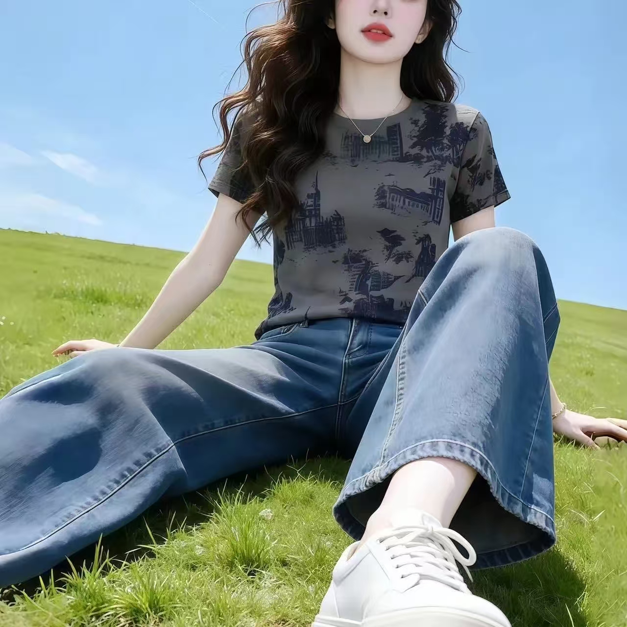 BY14804# 纯棉新款正肩圆领上衣复古印花时尚百搭T恤女 服裝批發女裝批發服飾貨源