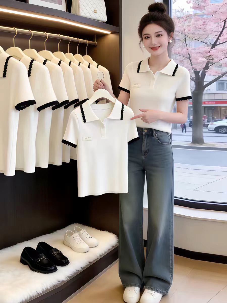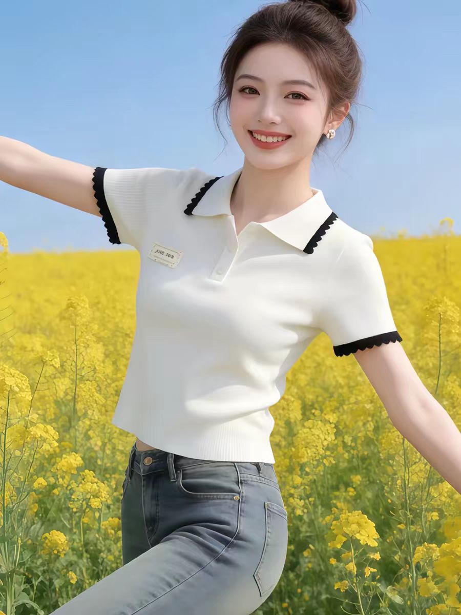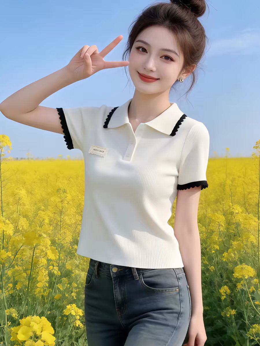 BY14805# 韩系气质白色polo领针织衫女夏季新款慵懒高级感休闲百搭上衣 服裝批發女裝批發服飾貨源