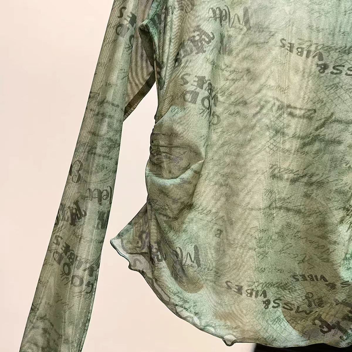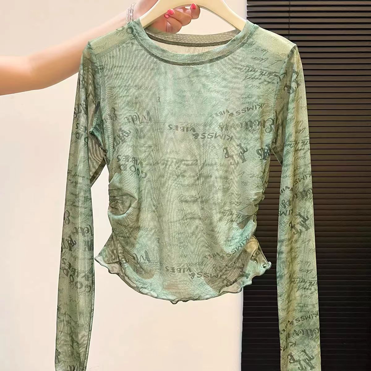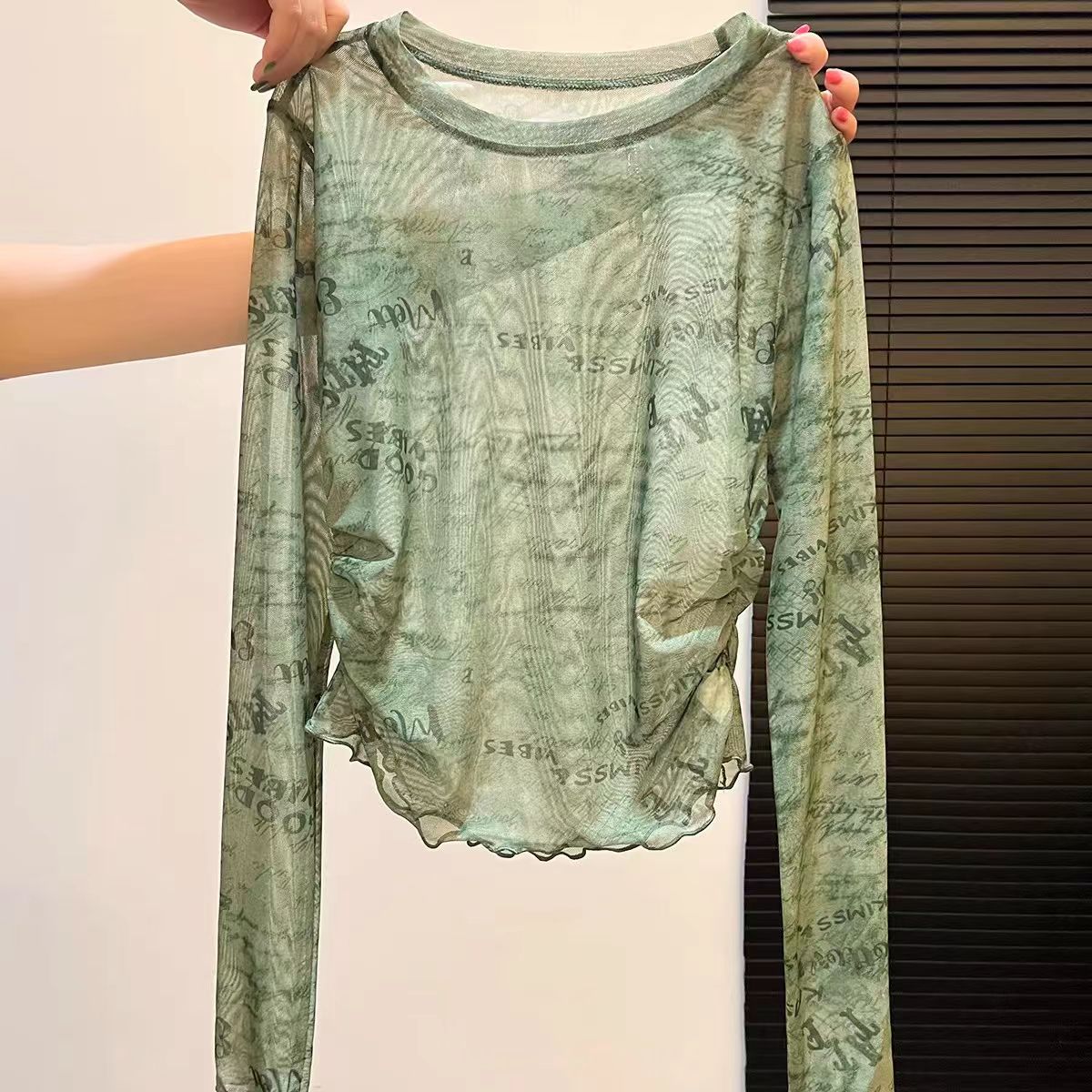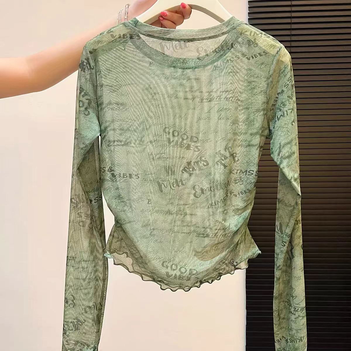BY14810# 春季款气质显瘦街头风字母印花网纱上衣设计感防晒衫微透女 服裝批發女裝批發服飾貨源