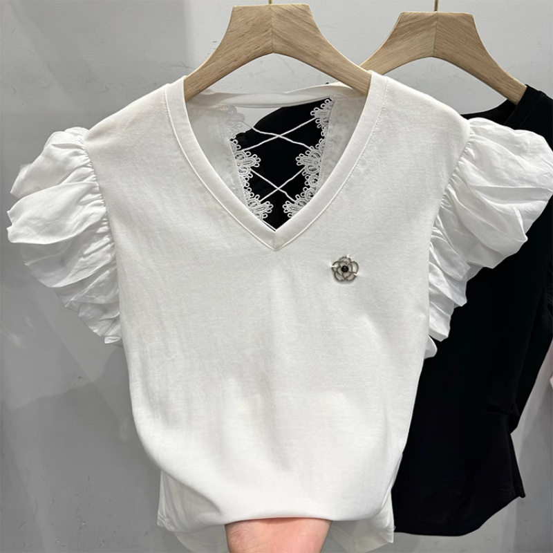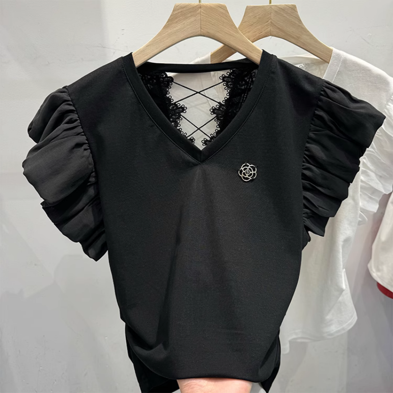 BY14813# 韩版修身短袖t恤女夏装新款后背镂空蕾丝拼接飞飞袖甜美上衣 服裝批發女裝批發服飾貨源