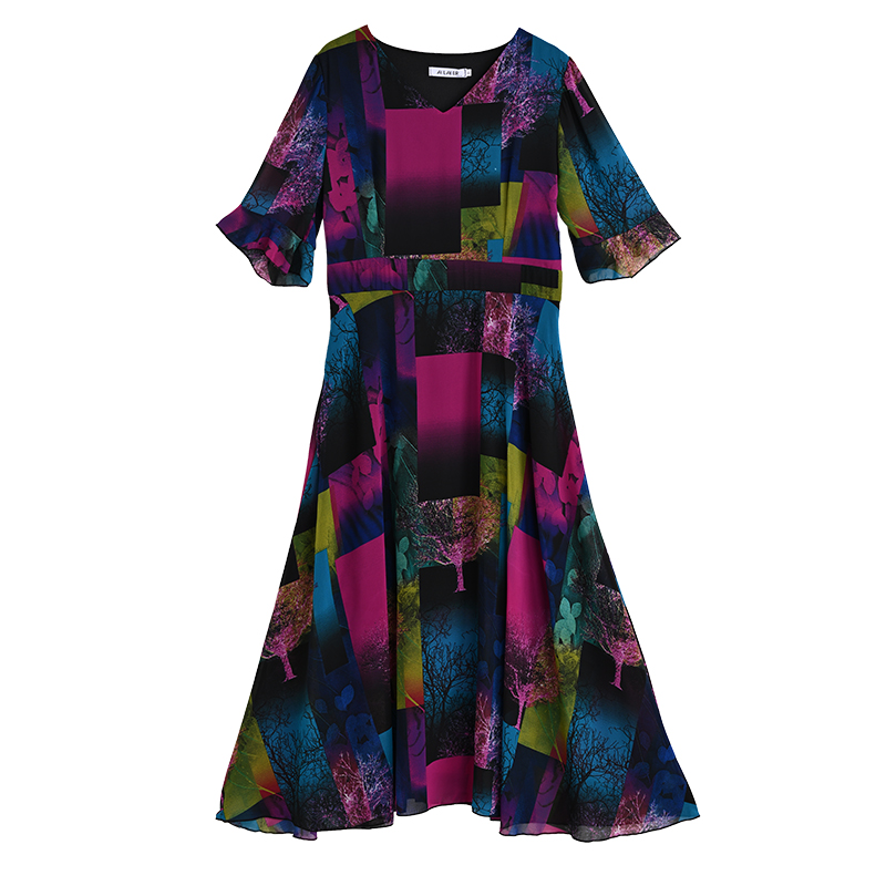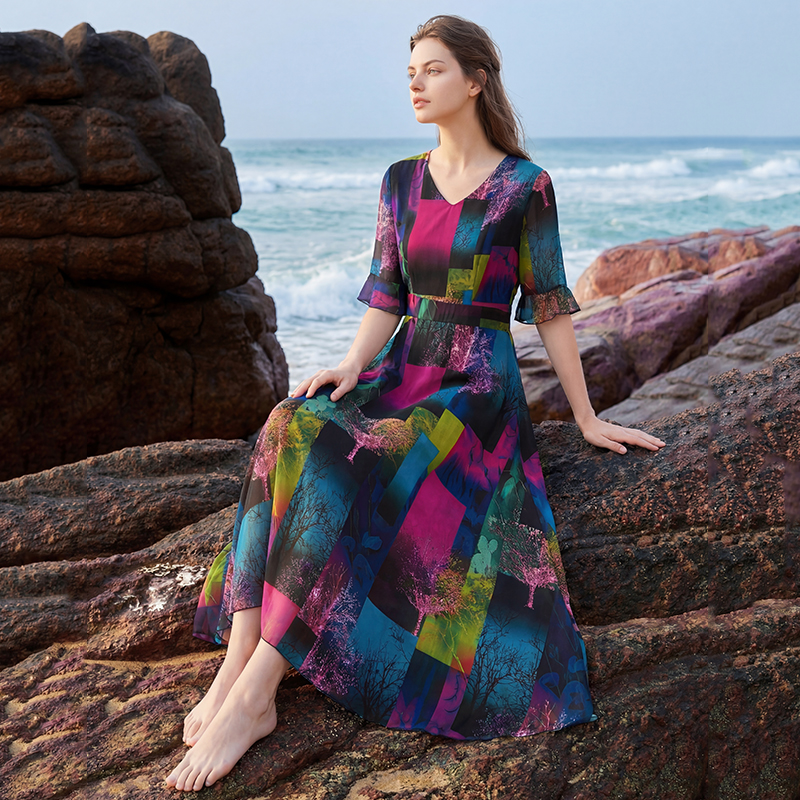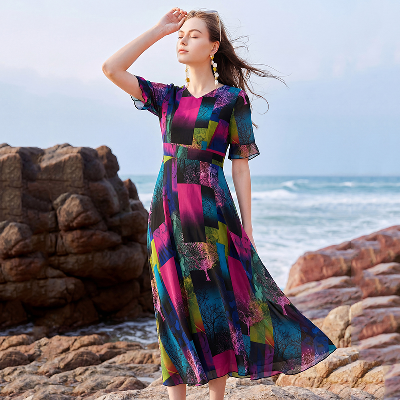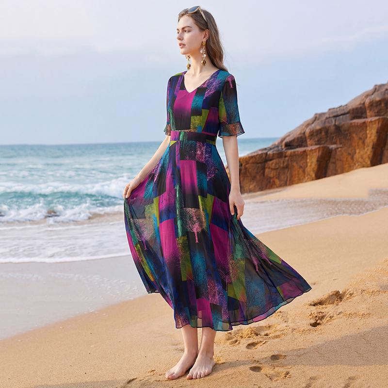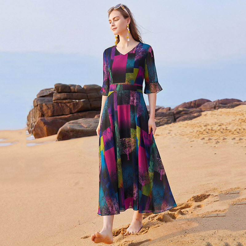 BY14815# 新款夏季印花雪纺v领套头高腰甜美度假沙滩显瘦连衣长裙 服裝批發女裝批發服飾貨源