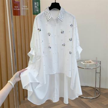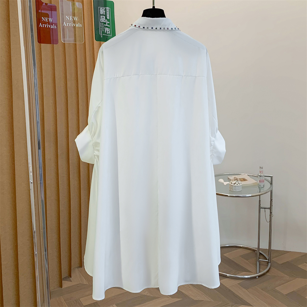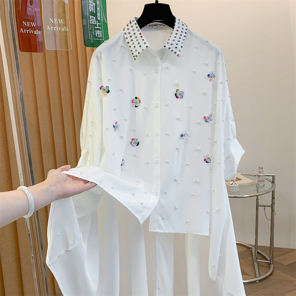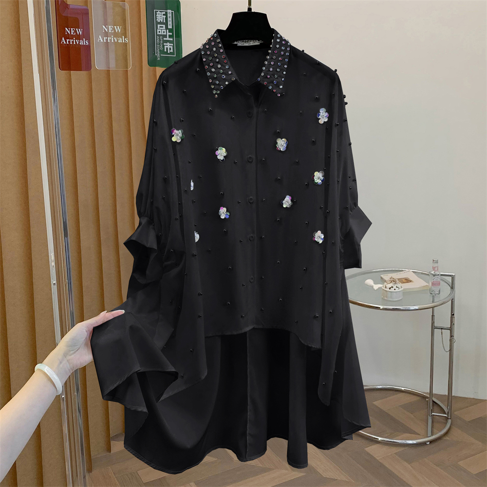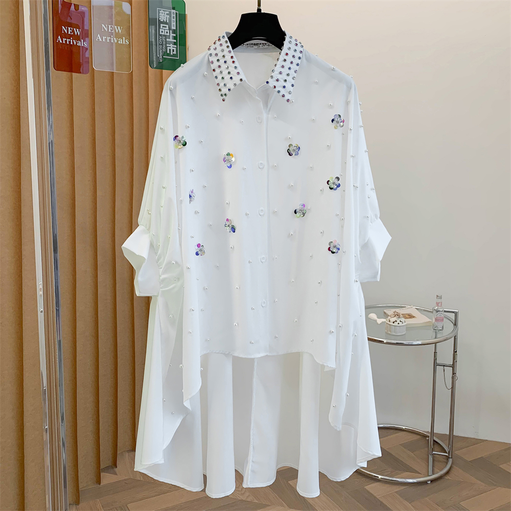 BY14831# 小众设计感亮片花中长款衬衫上衣宽松大码钉珠镶钻衬衫裙时尚 服裝批發女裝批發服飾貨源