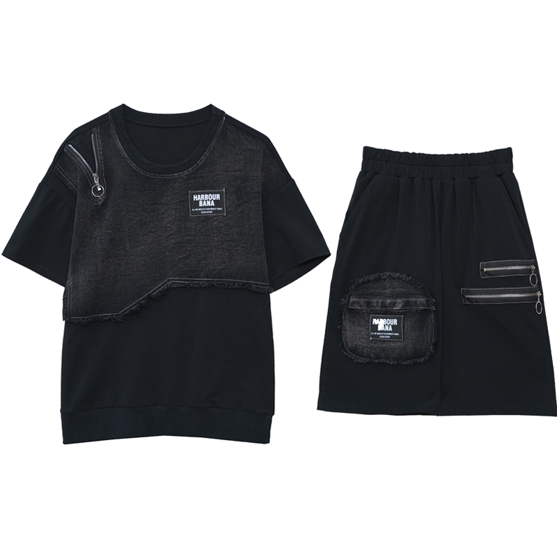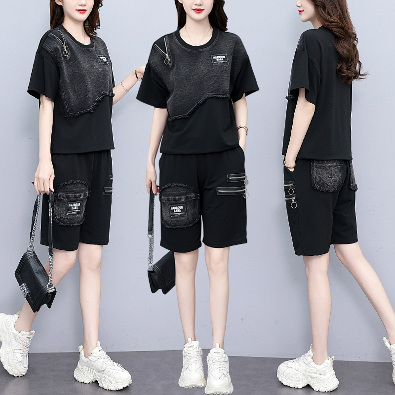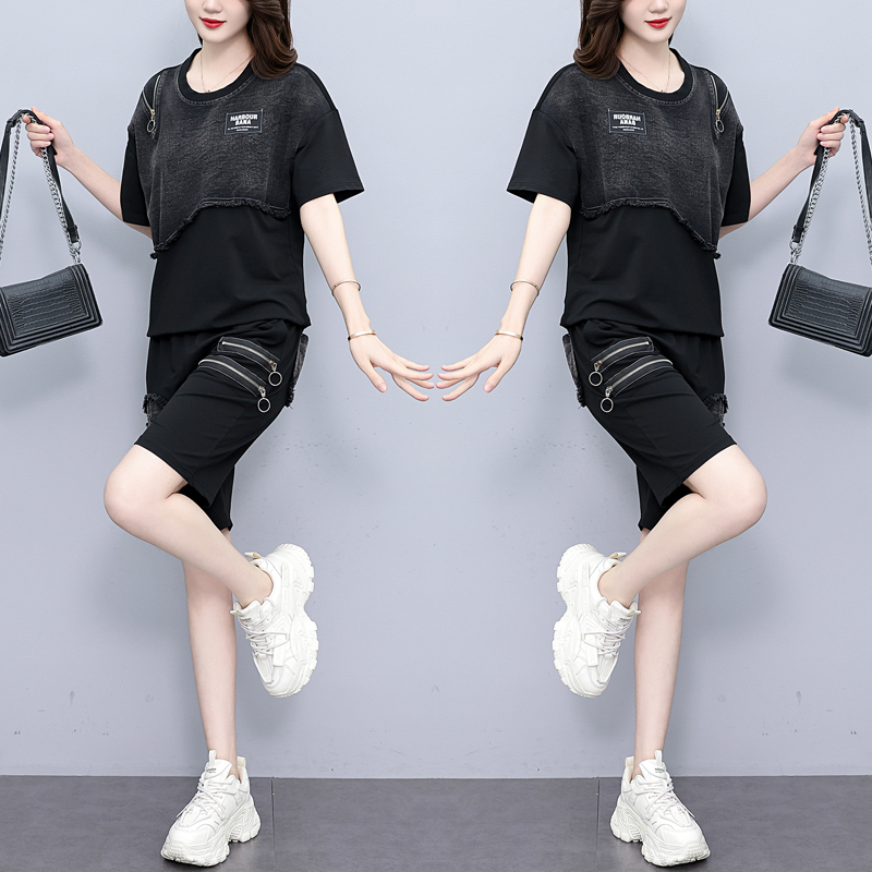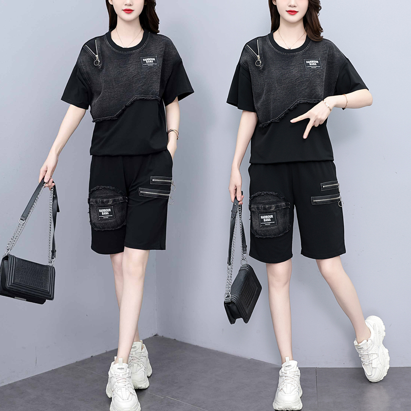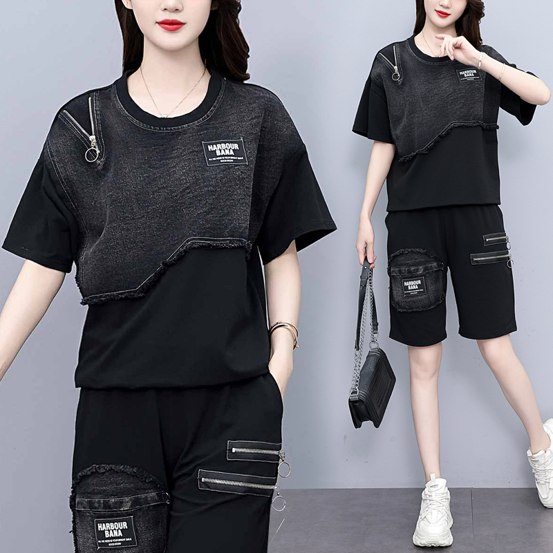 BY14838# 夏季套装女宽松拼接牛仔短袖五分裤两件套时尚个性大码女装 服裝批發女裝批發服飾貨源