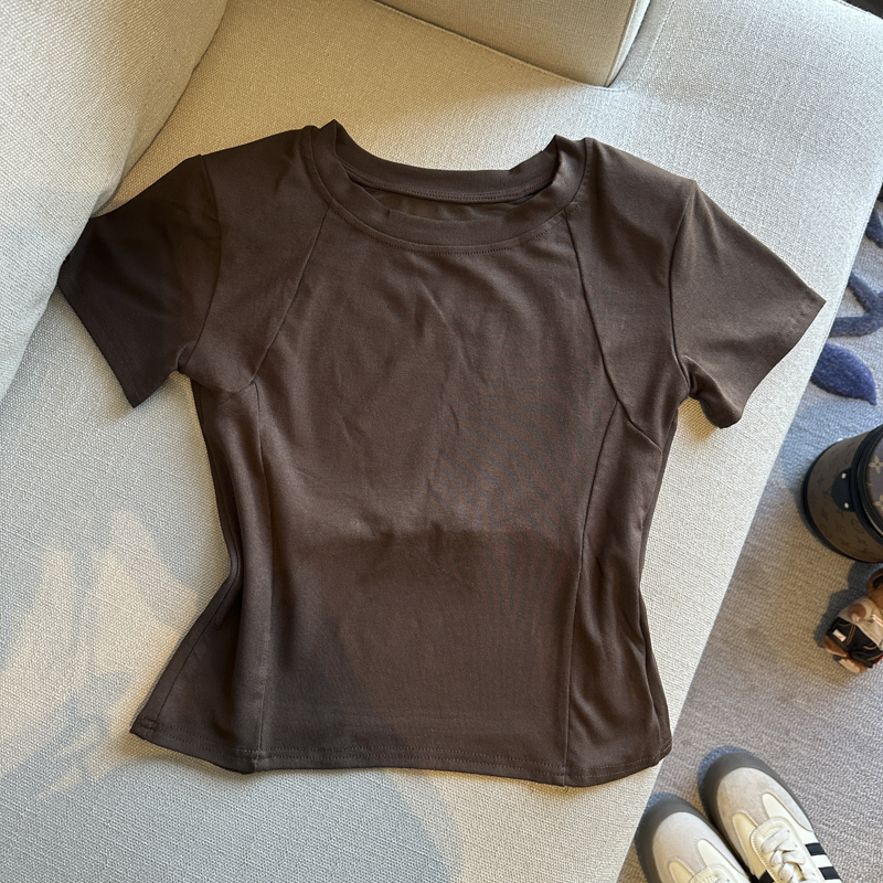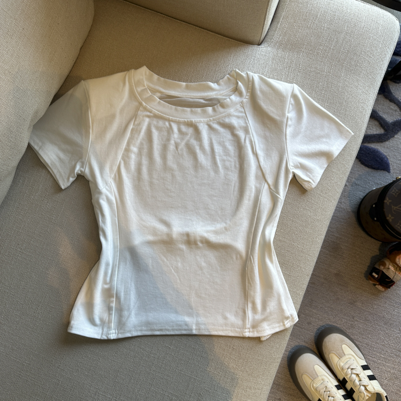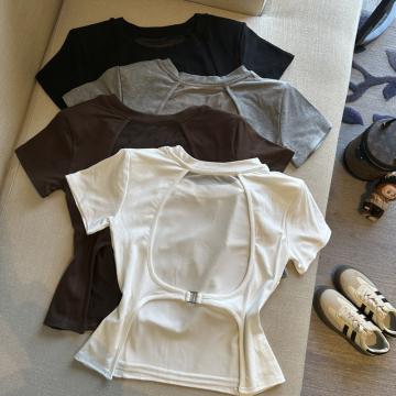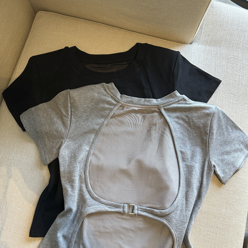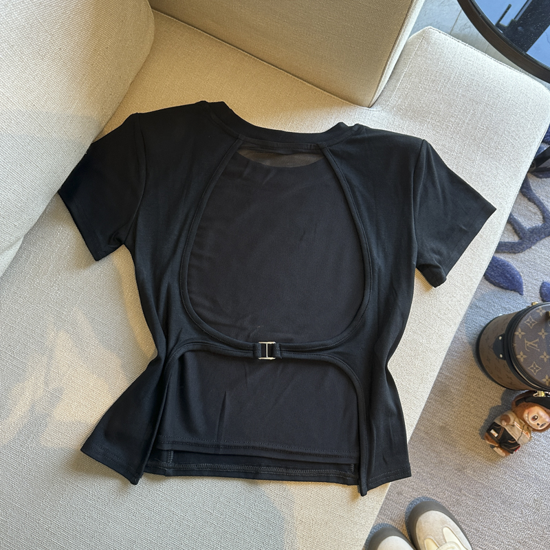BY14864# 春夏圆领网纱露背洋气短袖T恤女装小众修身显瘦上衣 服裝批發女裝批發服飾貨源