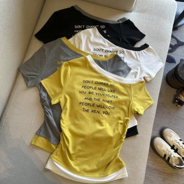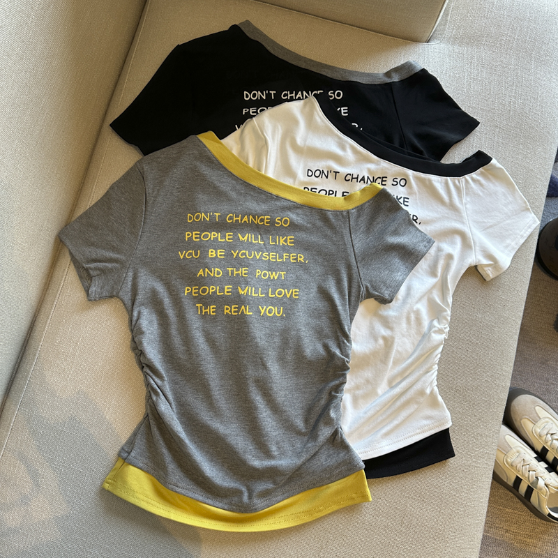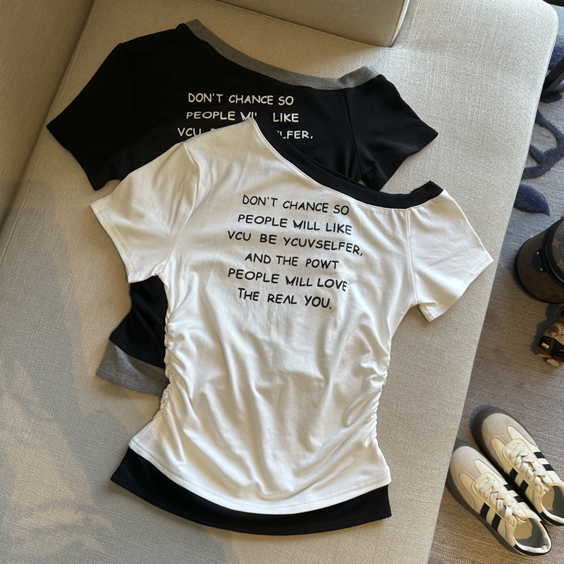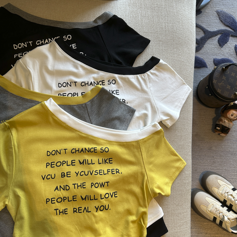 BY14865# 夏季新款韩版时尚斜肩字母印花短袖T恤女修身显瘦百搭上衣女 服裝批發女裝批發服飾貨源