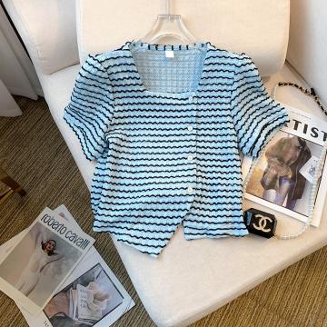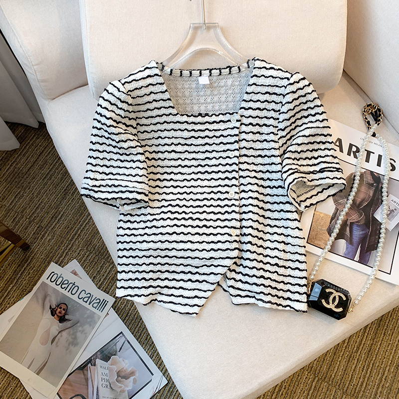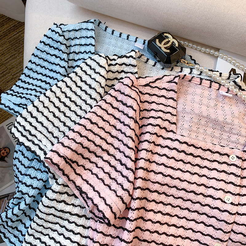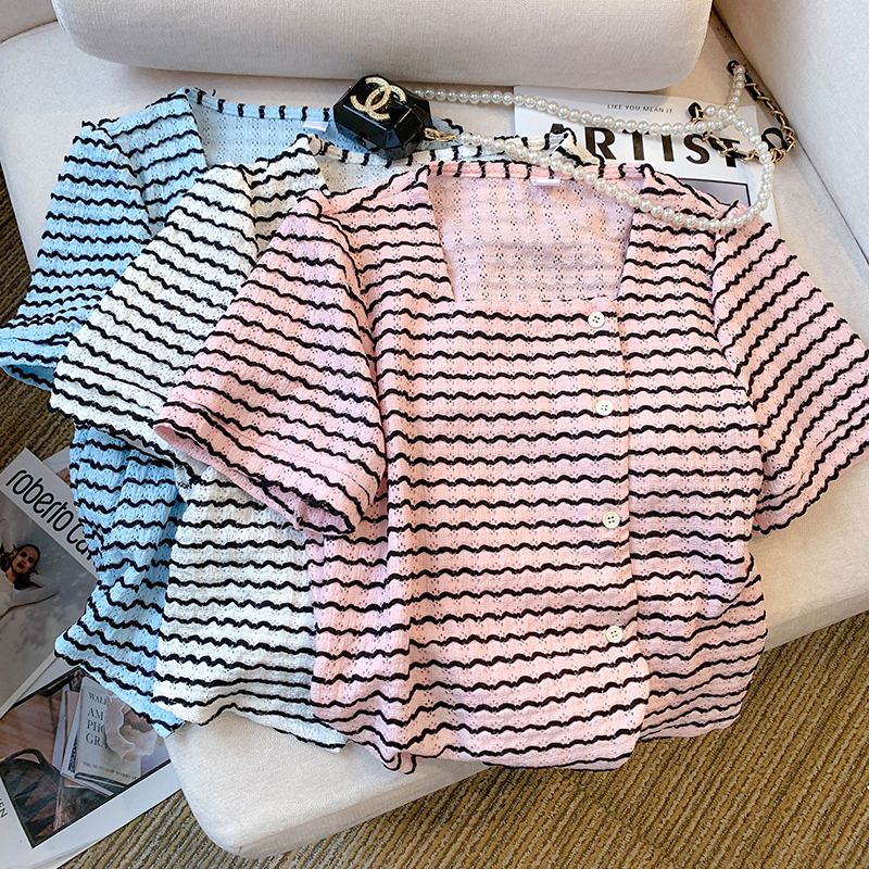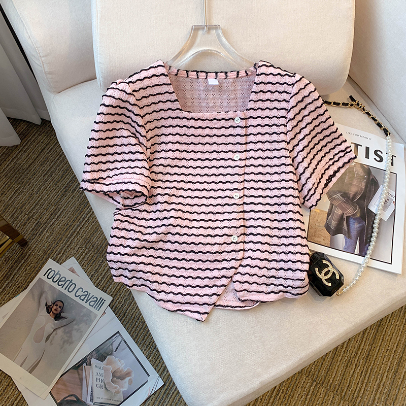 BY14993# 夏季新款设计感小香风条纹衬衣不规则短款上衣女 服裝批發女裝批發服飾貨源