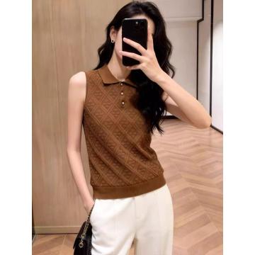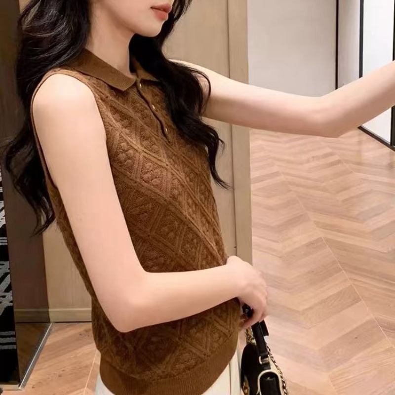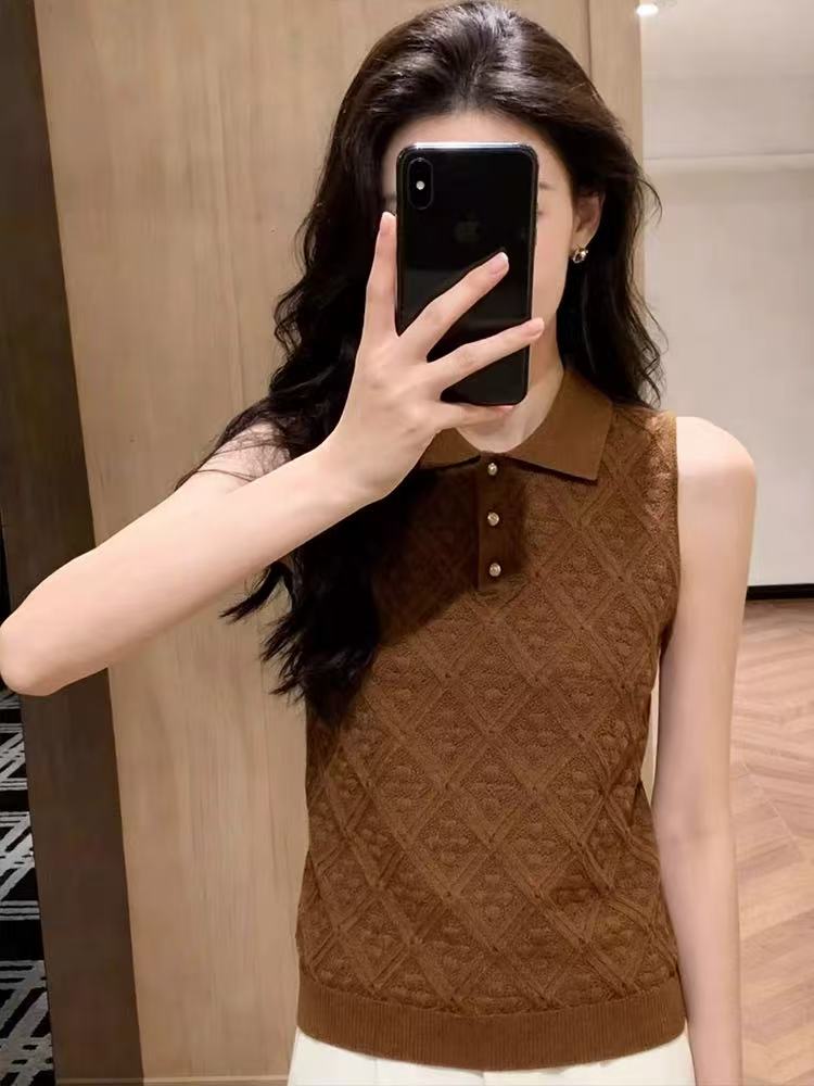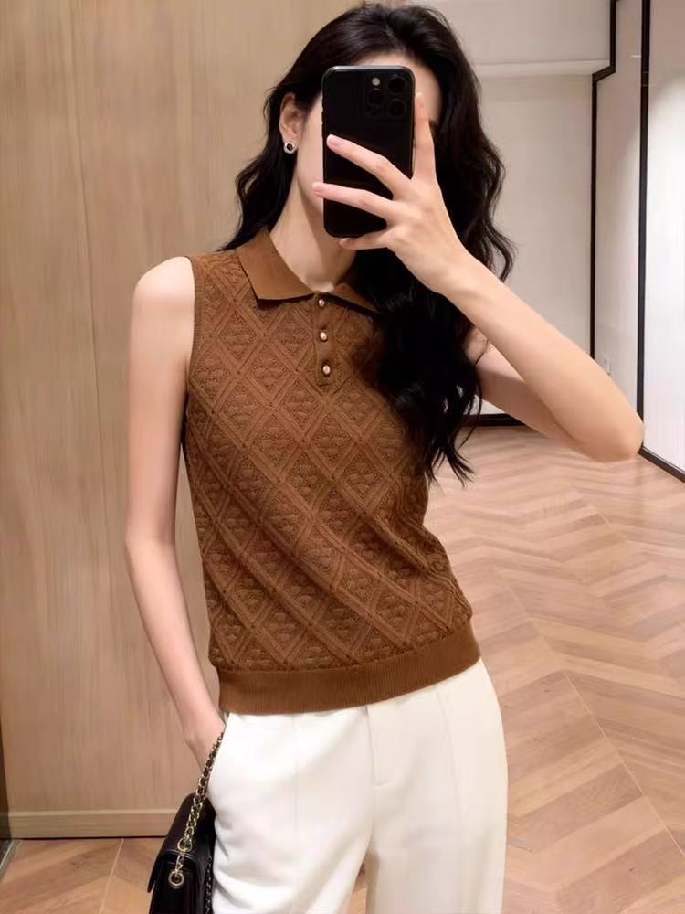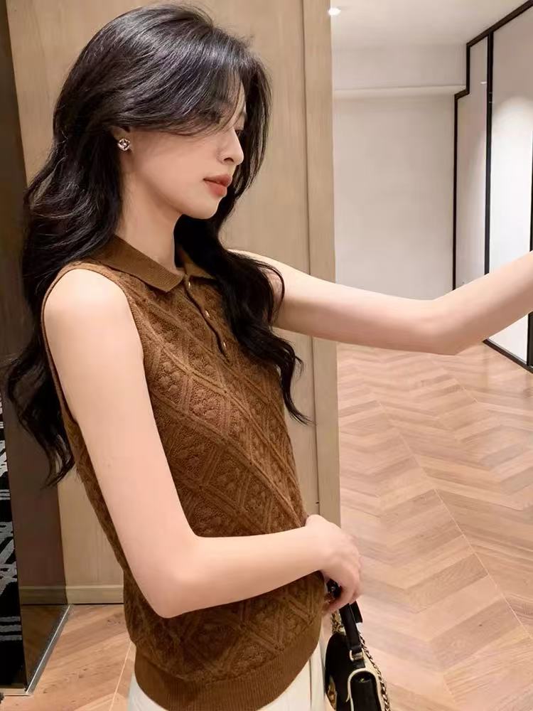 BY15036# 复古风针织翻领背心大码胖MM女外穿菱格纹无袖上衣通勤高级感减龄 服裝批發女裝批發服飾貨源